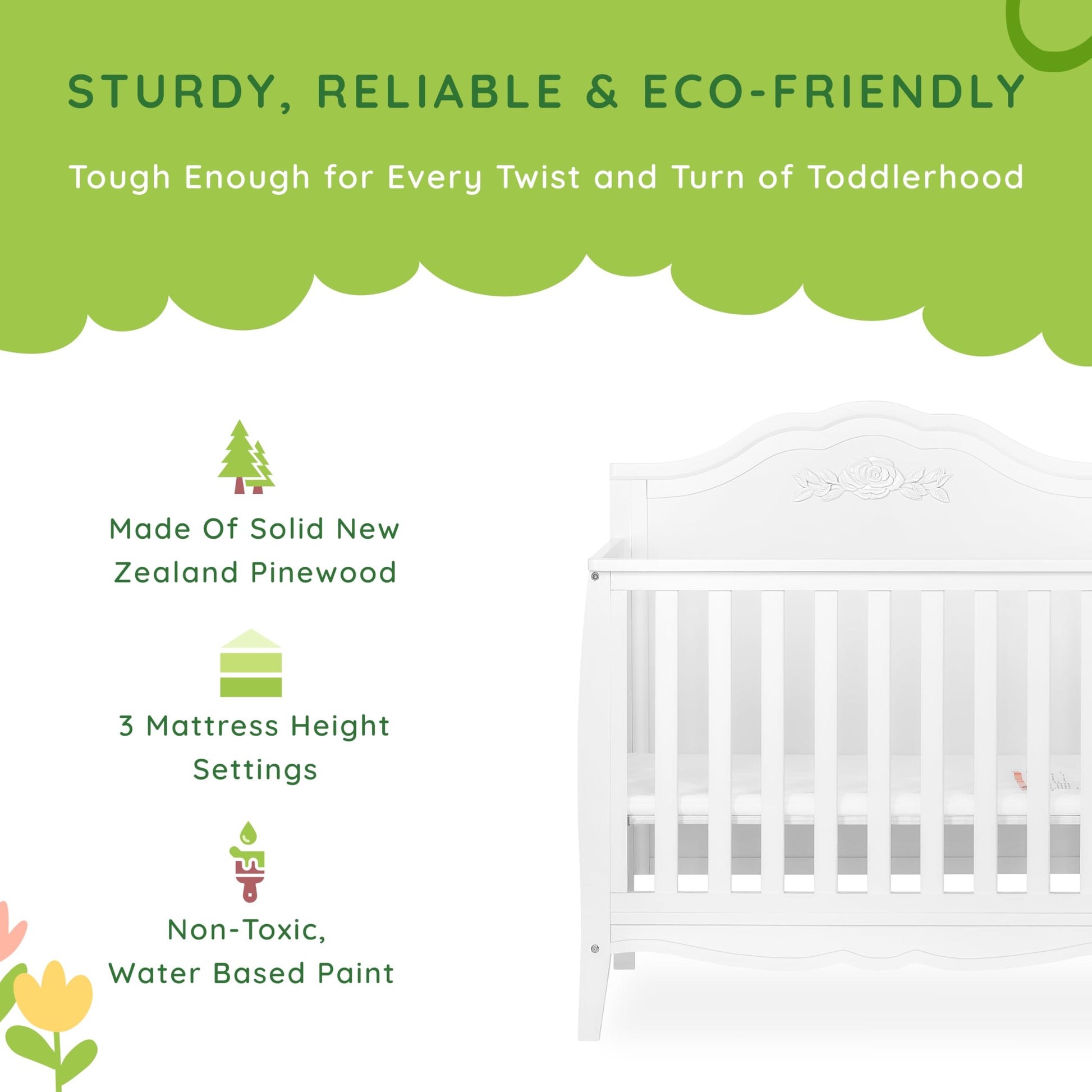 - INTRICATE & VERSATILE: The crib boasts of intricate Rose headboard detailing and is available in 4 lovely finishes - Blush Pink, Lavender Ice, Platinum & White