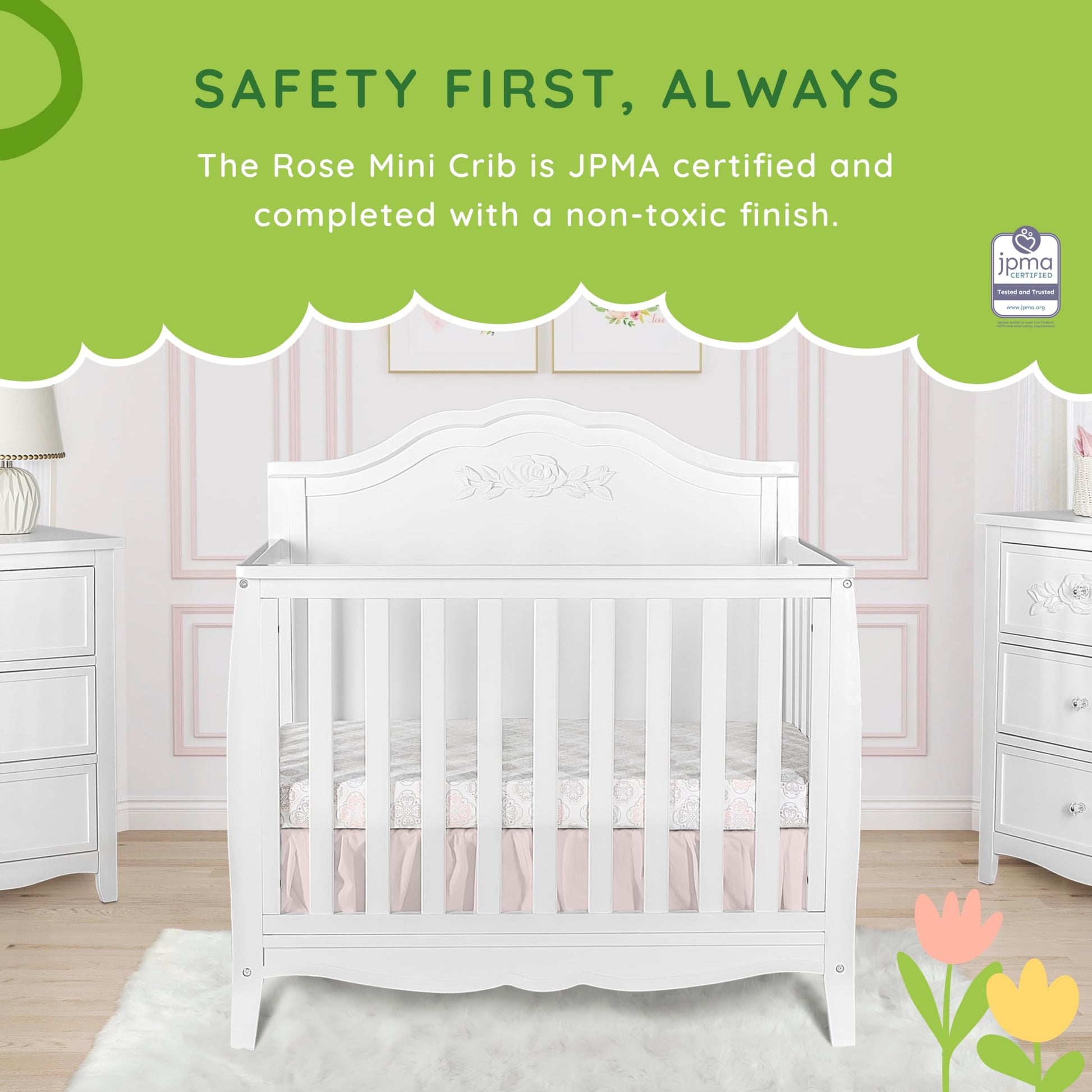 - SAFETY IS OUR PRIORITY: The Rose Mini Crib is JPMA certified and completed with a non-toxic finish. Safety note: maximum weight capacity of the crib is 50 lbs.