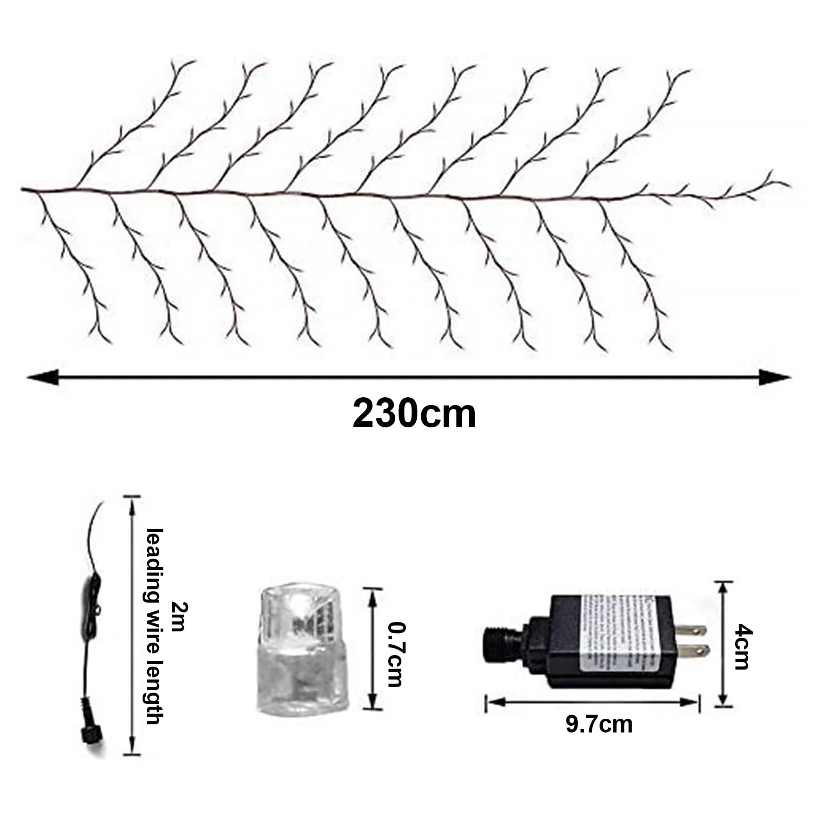 - Size & Specs: The vine lights are about 7.5 feet long with 18 branches, each adorned with 8 LED lights for a total of 144 LEDs. They come with a 6.5-foot cable and a 24V power adapter. Buying this item You will get 1 brown vine lights, 1 manual,1 apapter (No Remote).