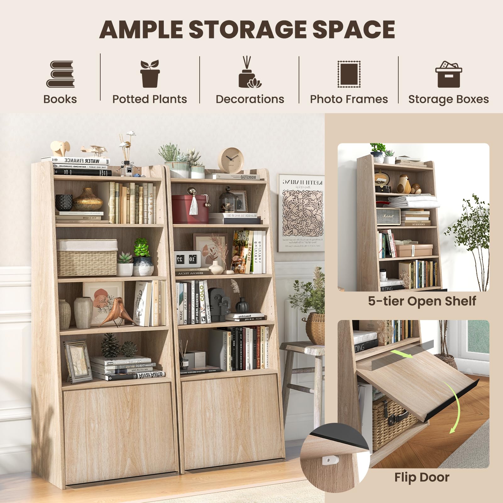Tier Bookcase, Modern Bookshelf w/ 2 Adjustable Shelves & Flip-up Door, Wood Storage