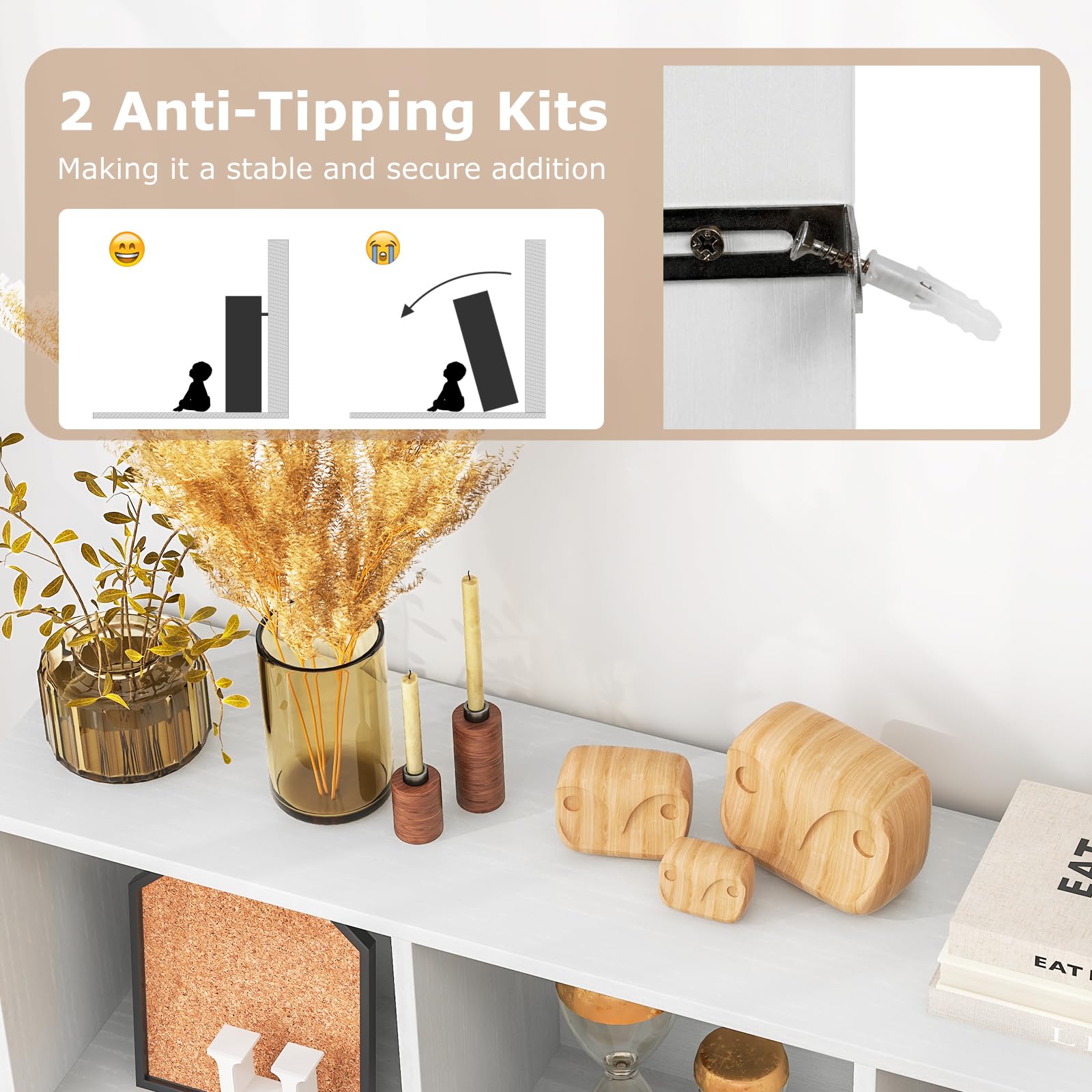 8-Cube Bookshelf, 39.5”L Floor Bookcase with 2 Anti-Tipping Kits, Freestanding Storage Organizer, 4-Tier Display Shelf for Home, Office & Dorms, Natural/White (White, 8-Cube)