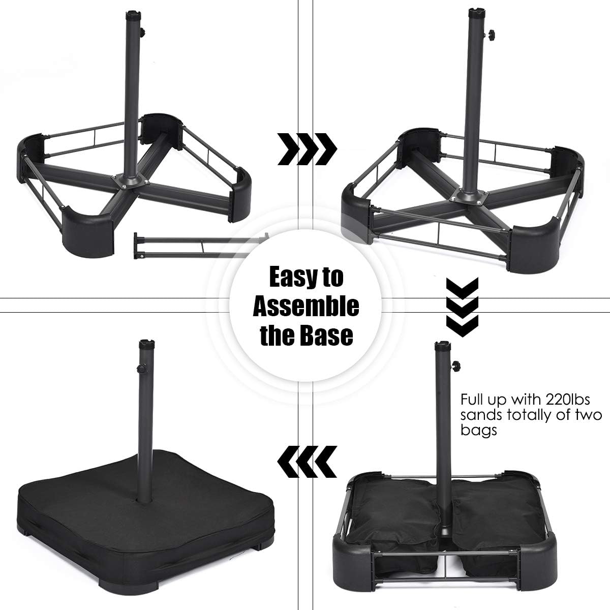 - Two Sandbags Included: Two sandbags are made of durable oxford fabric which is durable and water-proof for outdoor use. Designed for outdoor patio umbrella, this umbrella base stand can weigh up to 220 pounds for 2 bags when filled with sand, and keep umbrella stability in windy conditions.