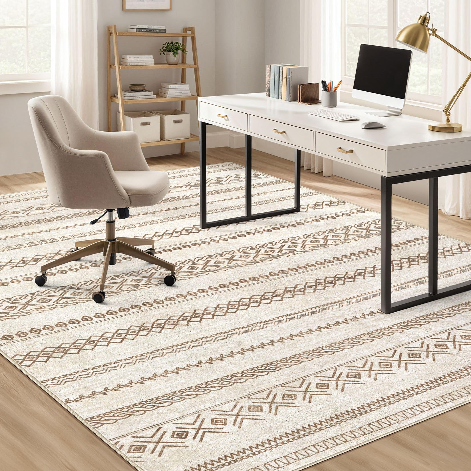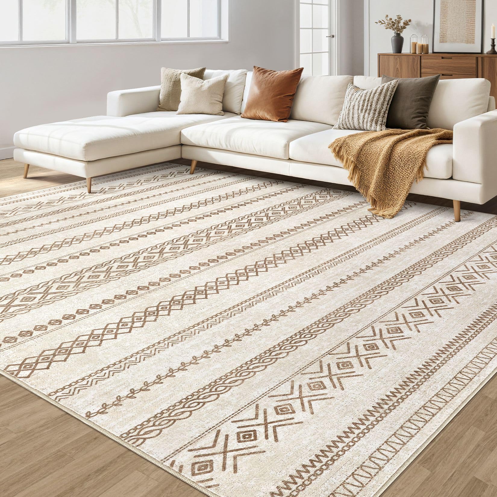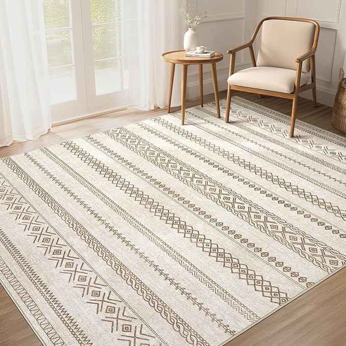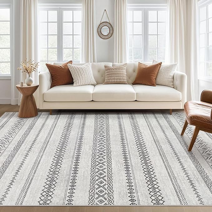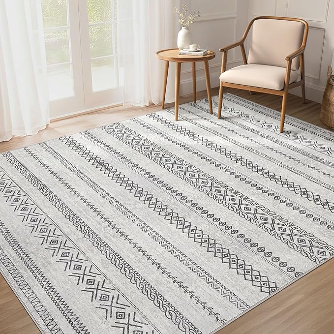 Area Rug 9x12 Washable Rug, Large Boho Moroccan Geometric Neutral Soft Rug for Living