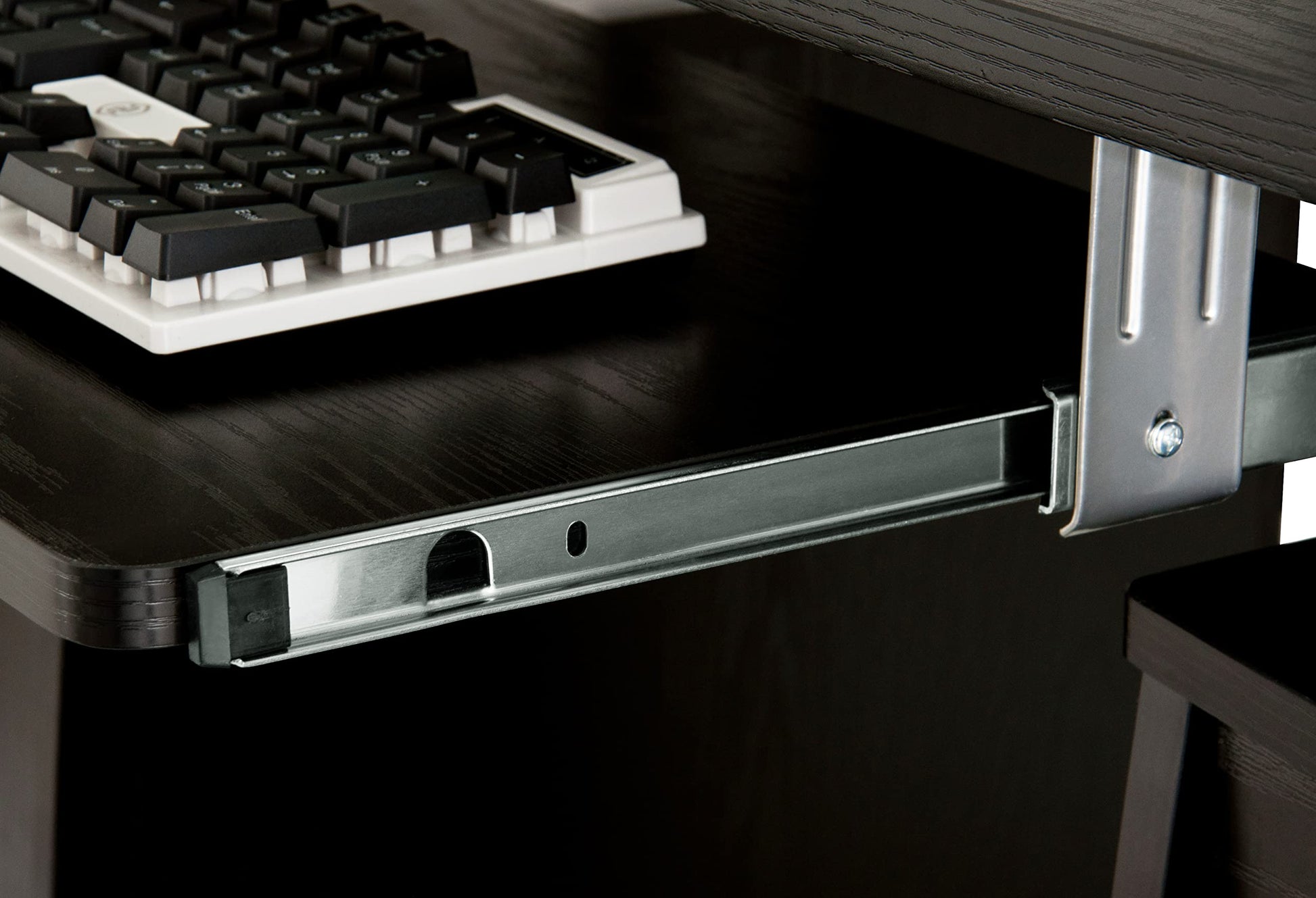 - Large slide-out keyboard shelf is equipped with a safety stop