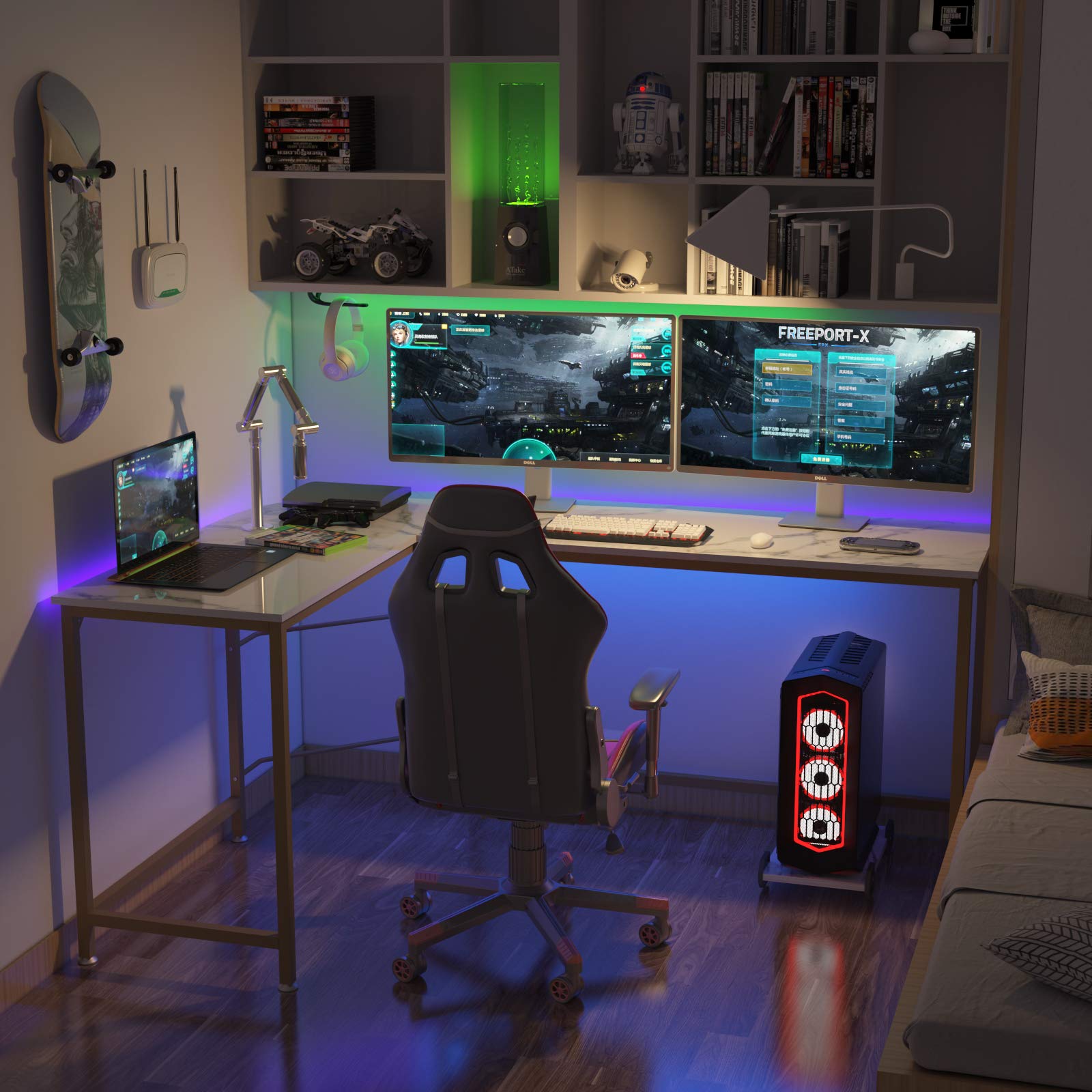 - L-Shaped Corner Design: L-shaped desk has enough space for monitors and laptops, maximize and create the ideal workspace, it also comes with a free CPU stand that places freely underneath.