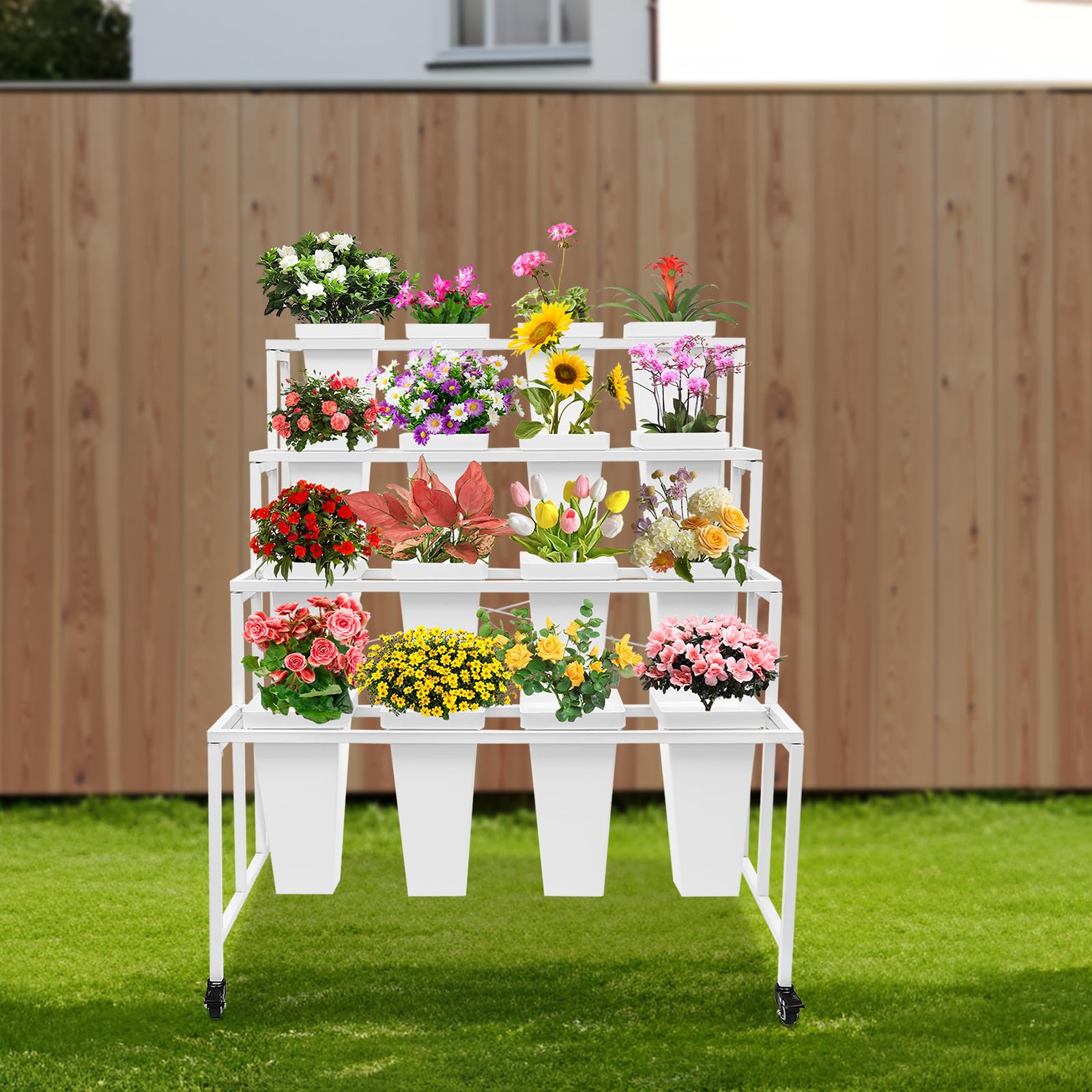 Flower Display Stand with Buckets, 4 Layers Metal Plant Stand with 16 Buckets