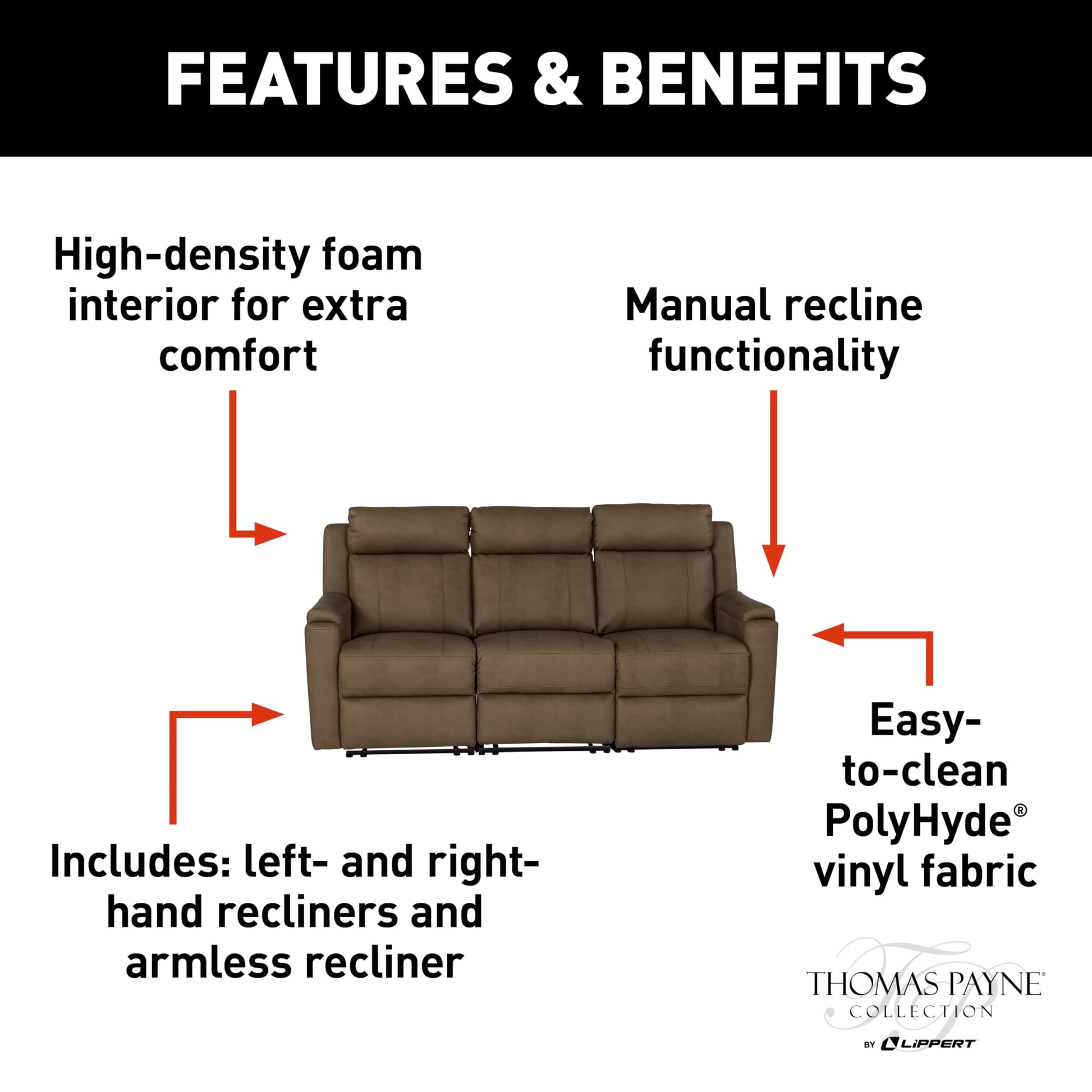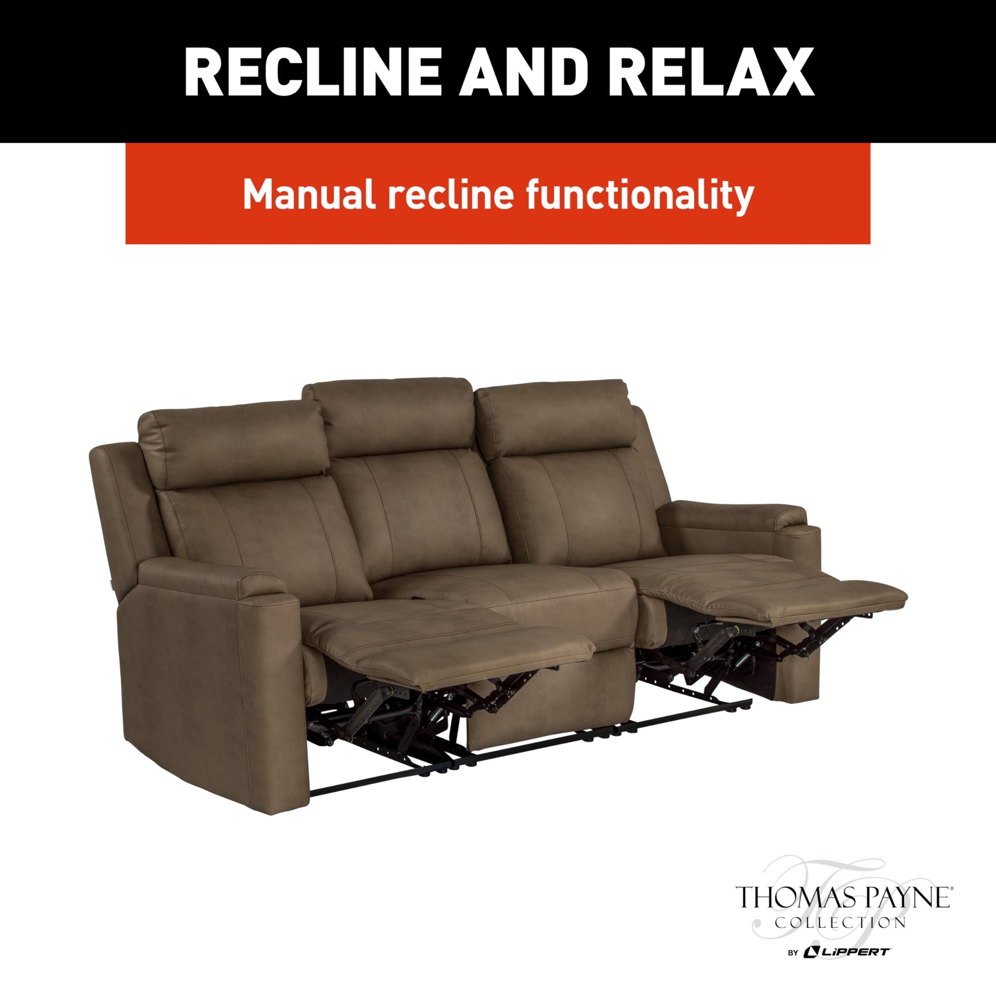 - DESIGNED FOR COMFORT This cozy, RV sofa set includes a chaise-style footrest and easy-to-use manual recline functionality
