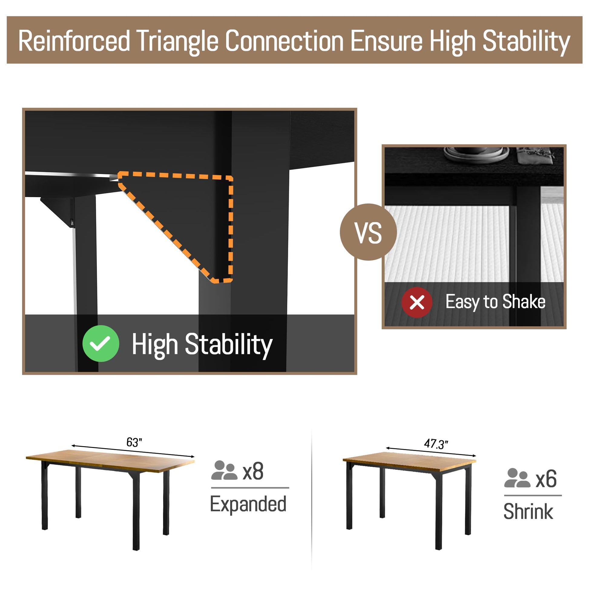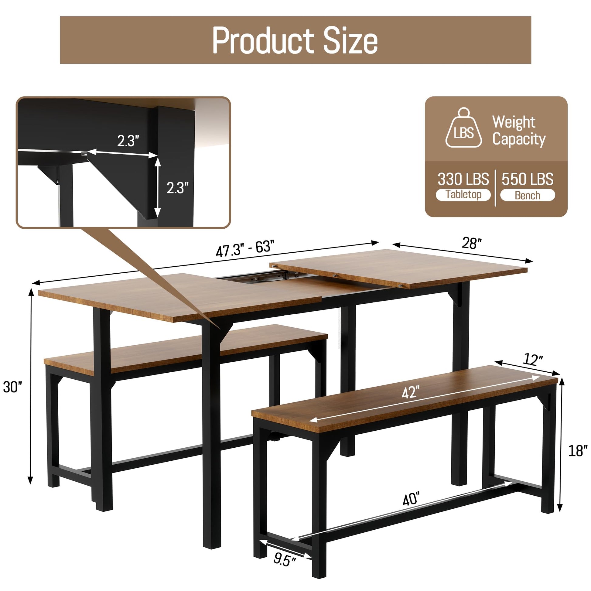 - 【Extendable & Space-saving Design】The dining table top is designed to be extendable, which gives you the flexibility to choose 47.3" long or 63'' long according to the size of the occasion and the number of people using it. When you don't need to use the dining table, you can tuck 2 benches underneath the table to save space