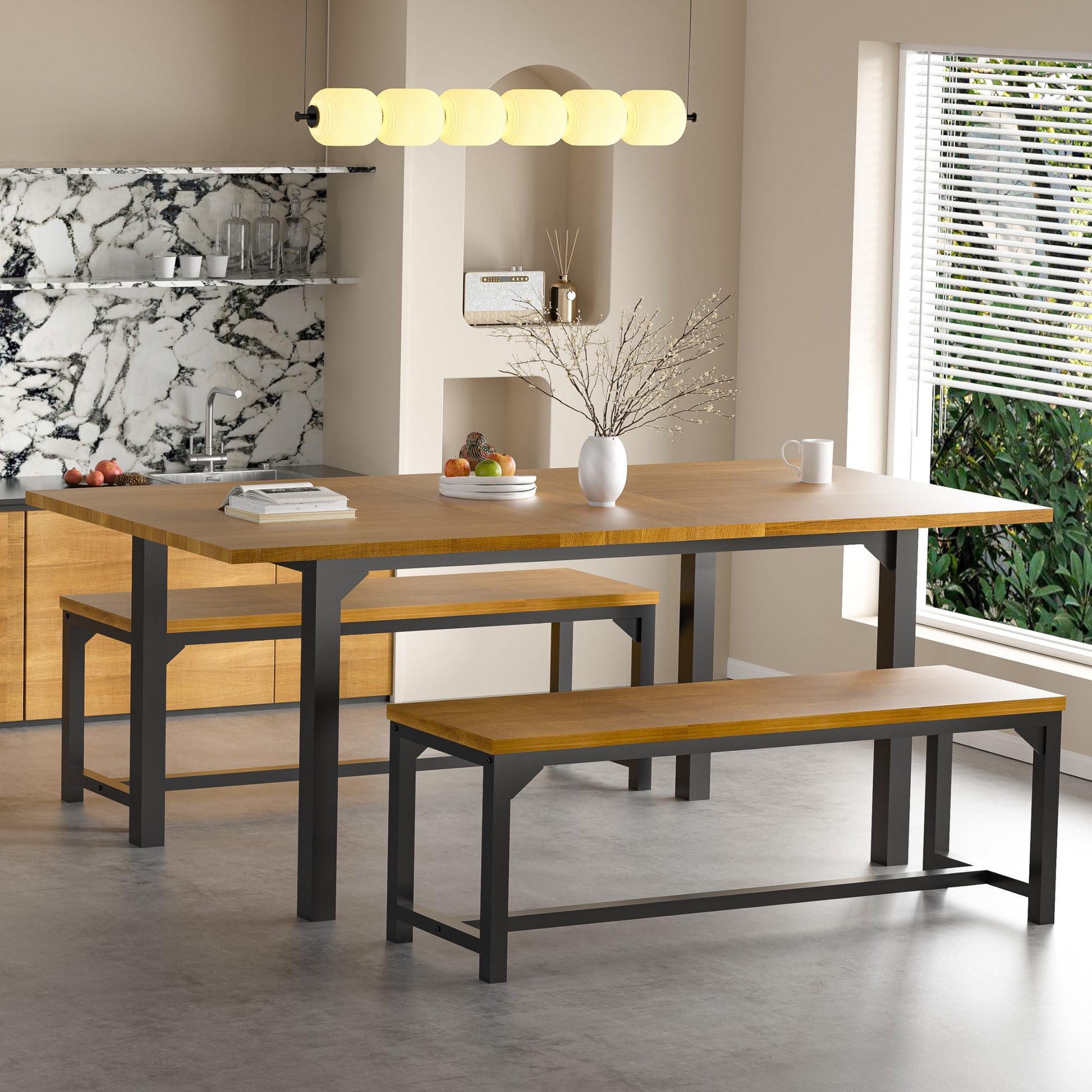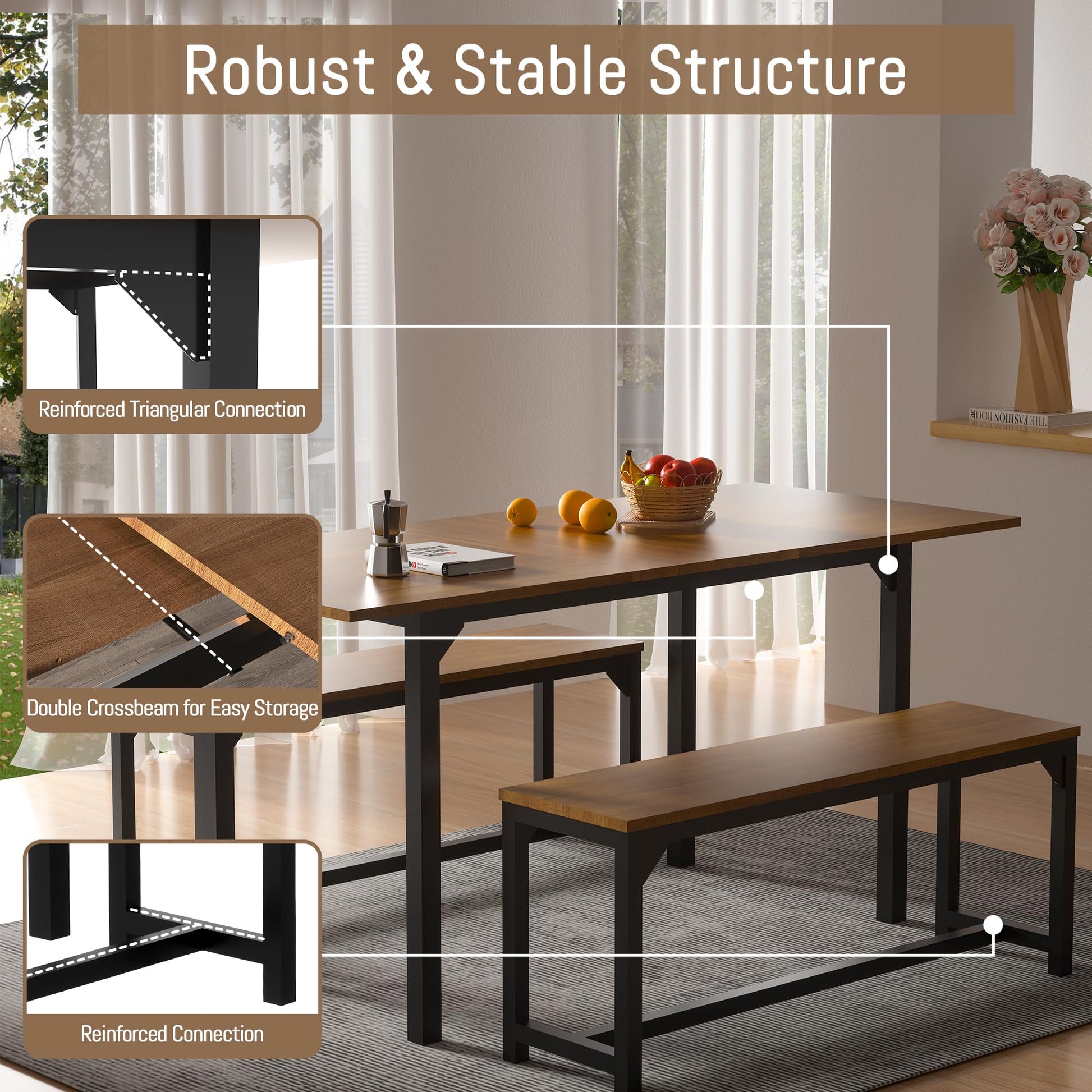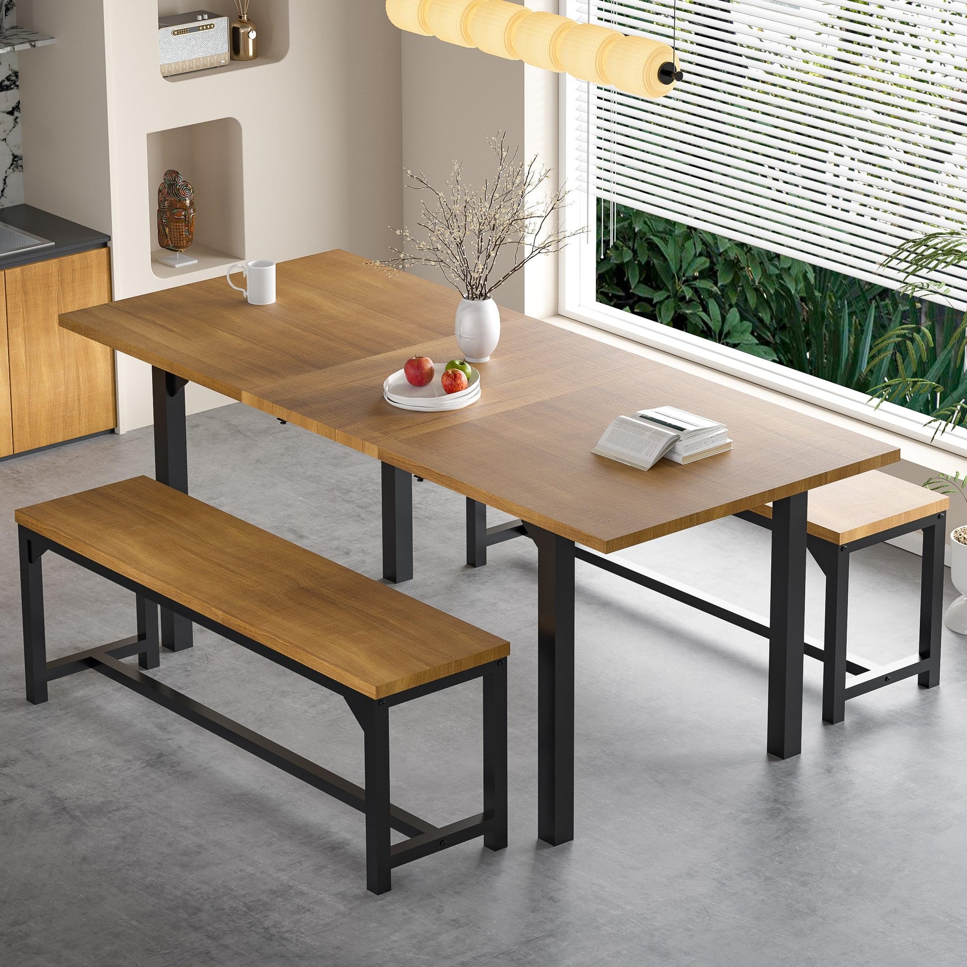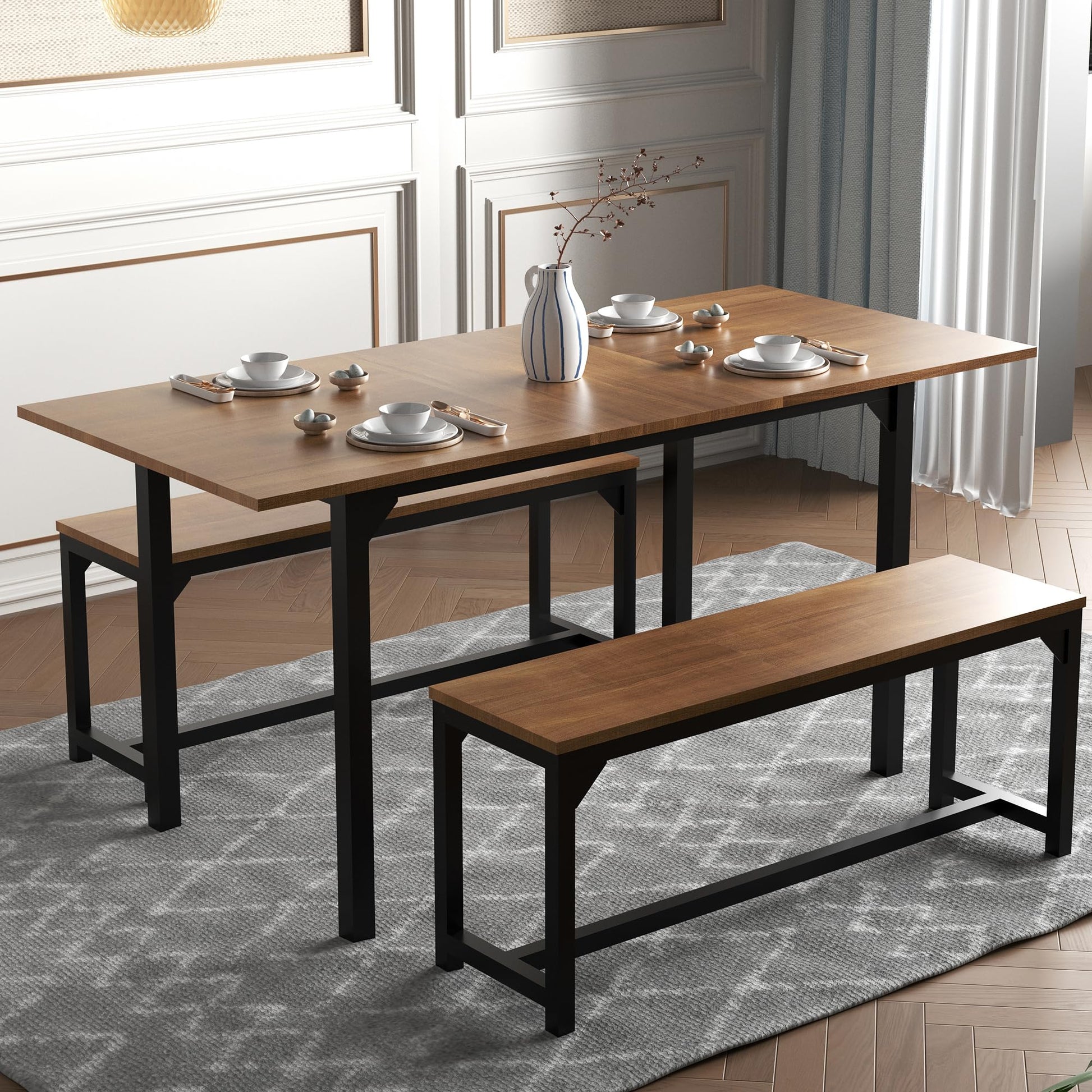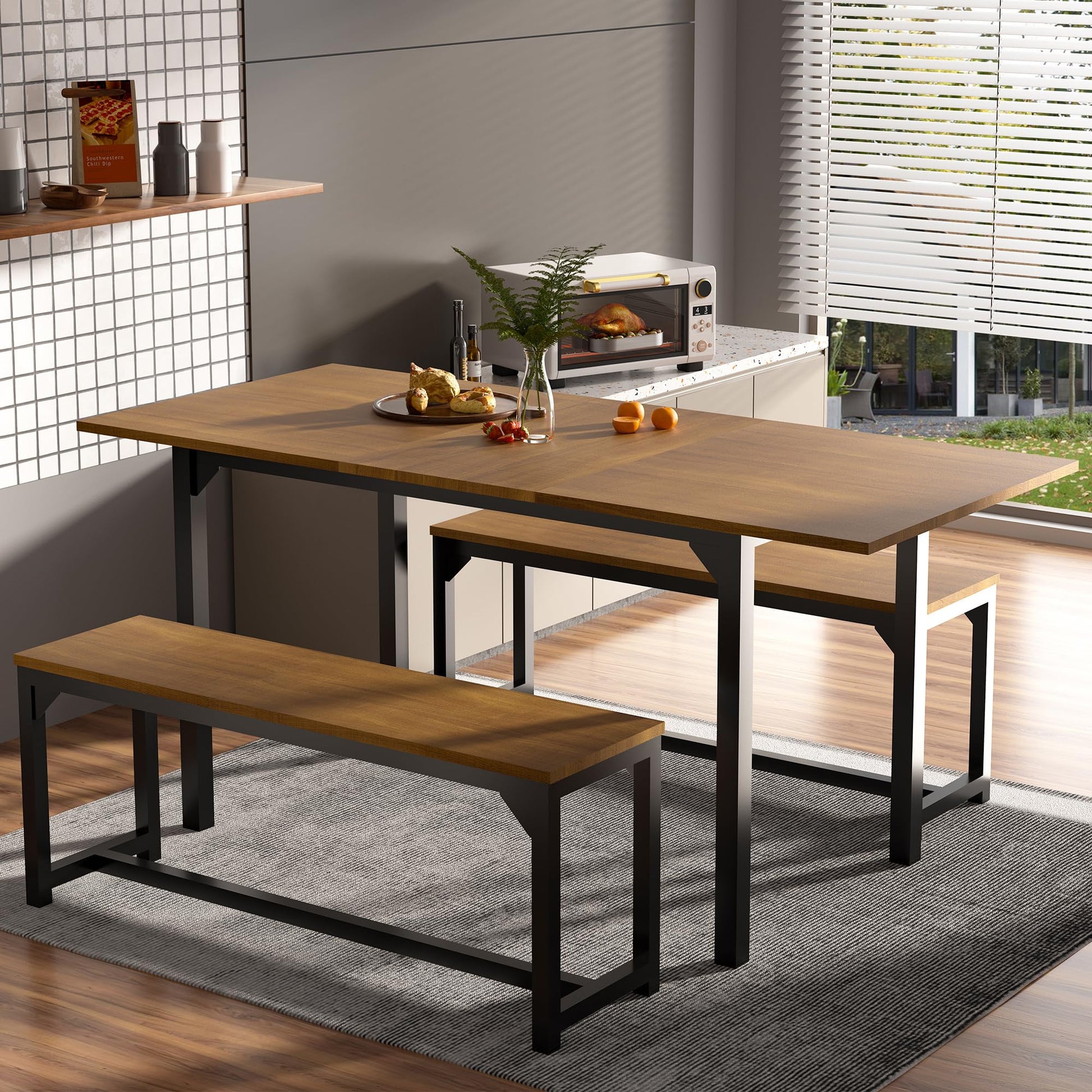 TOLEAD 63 Inch Dining Table Set for 4-8, 3-Piece Extendable Kitchen Table Set with 2 Benches, Metal Frame & Wood Board, Space-Saving Breakfast Dining Room Table Set for Home Kitchen, Walnut