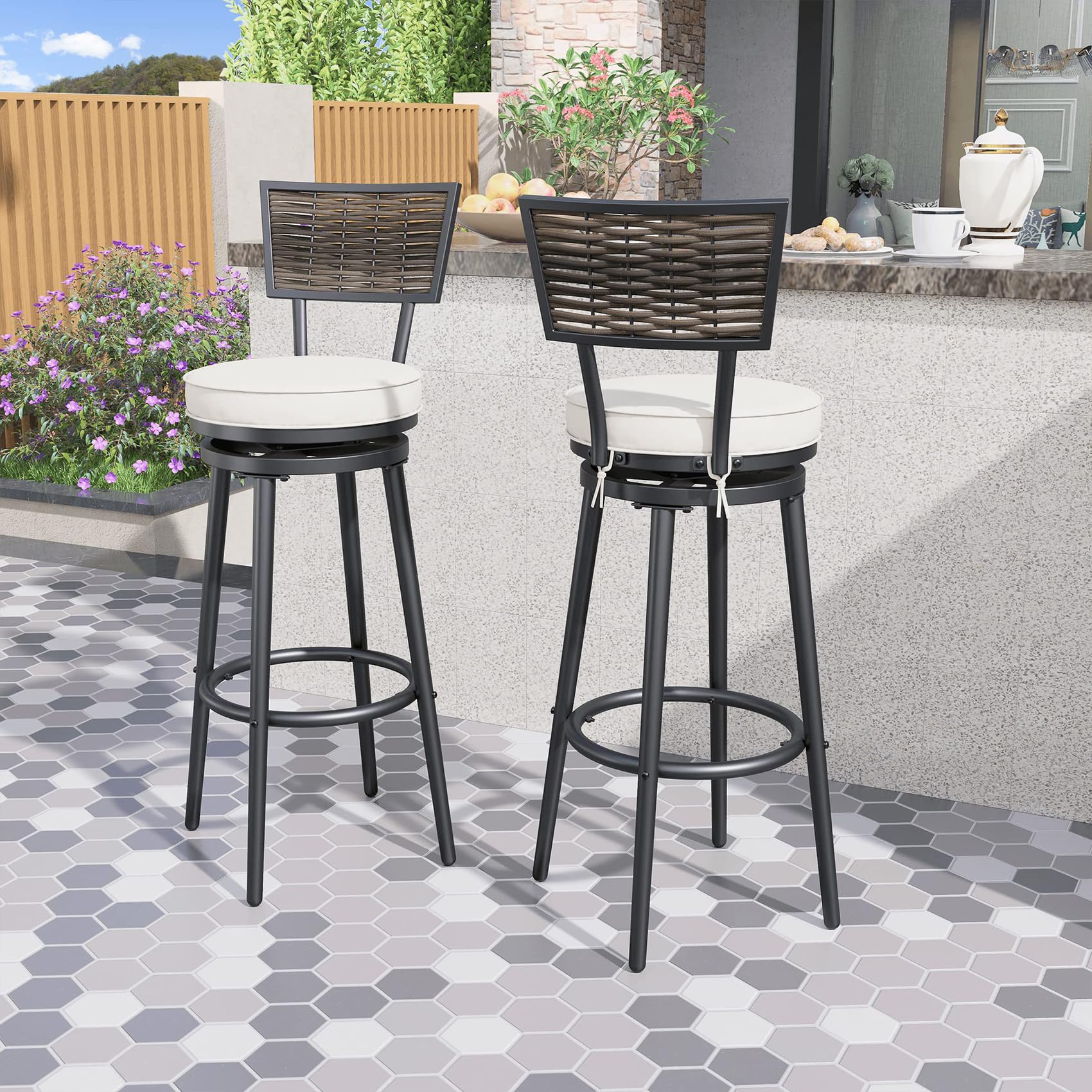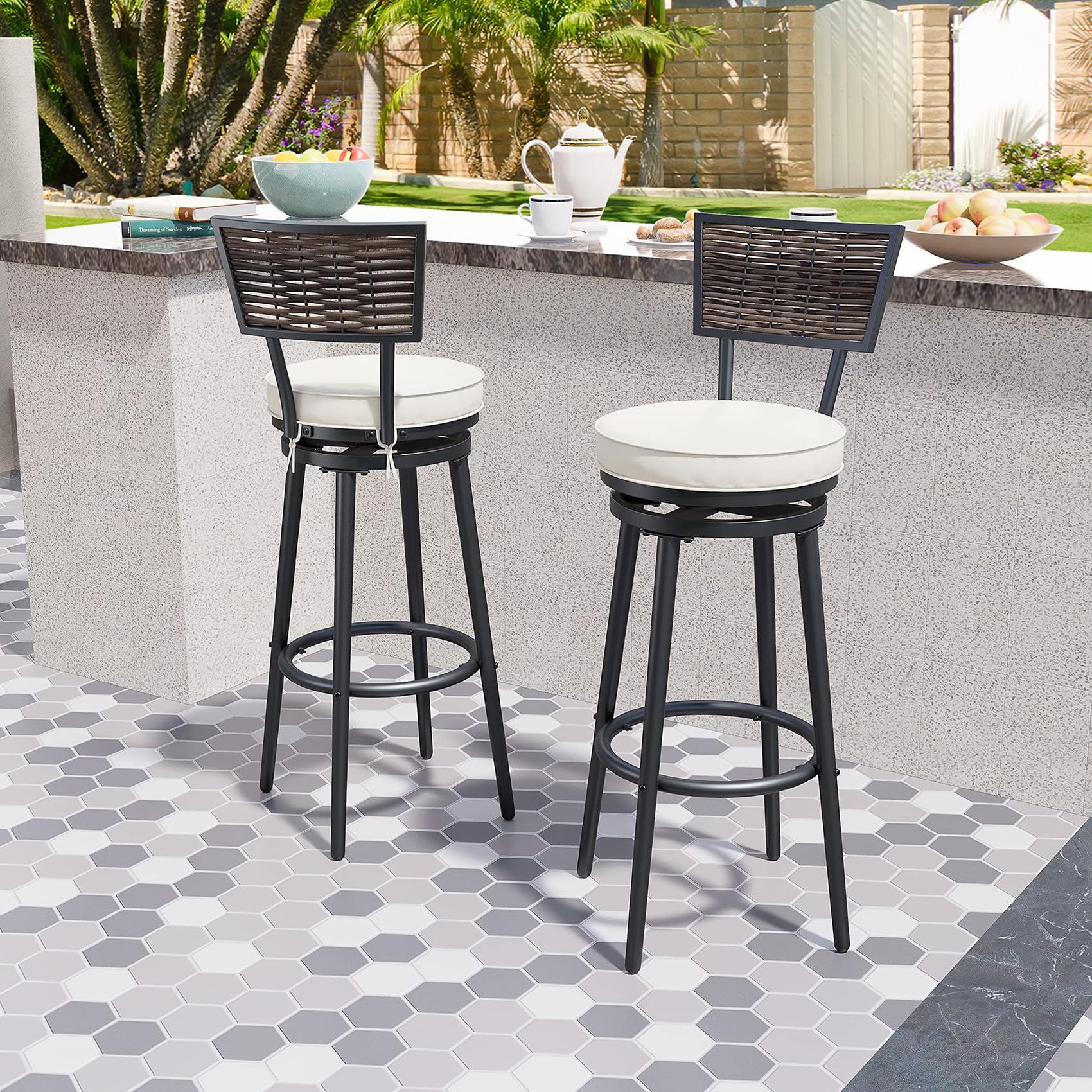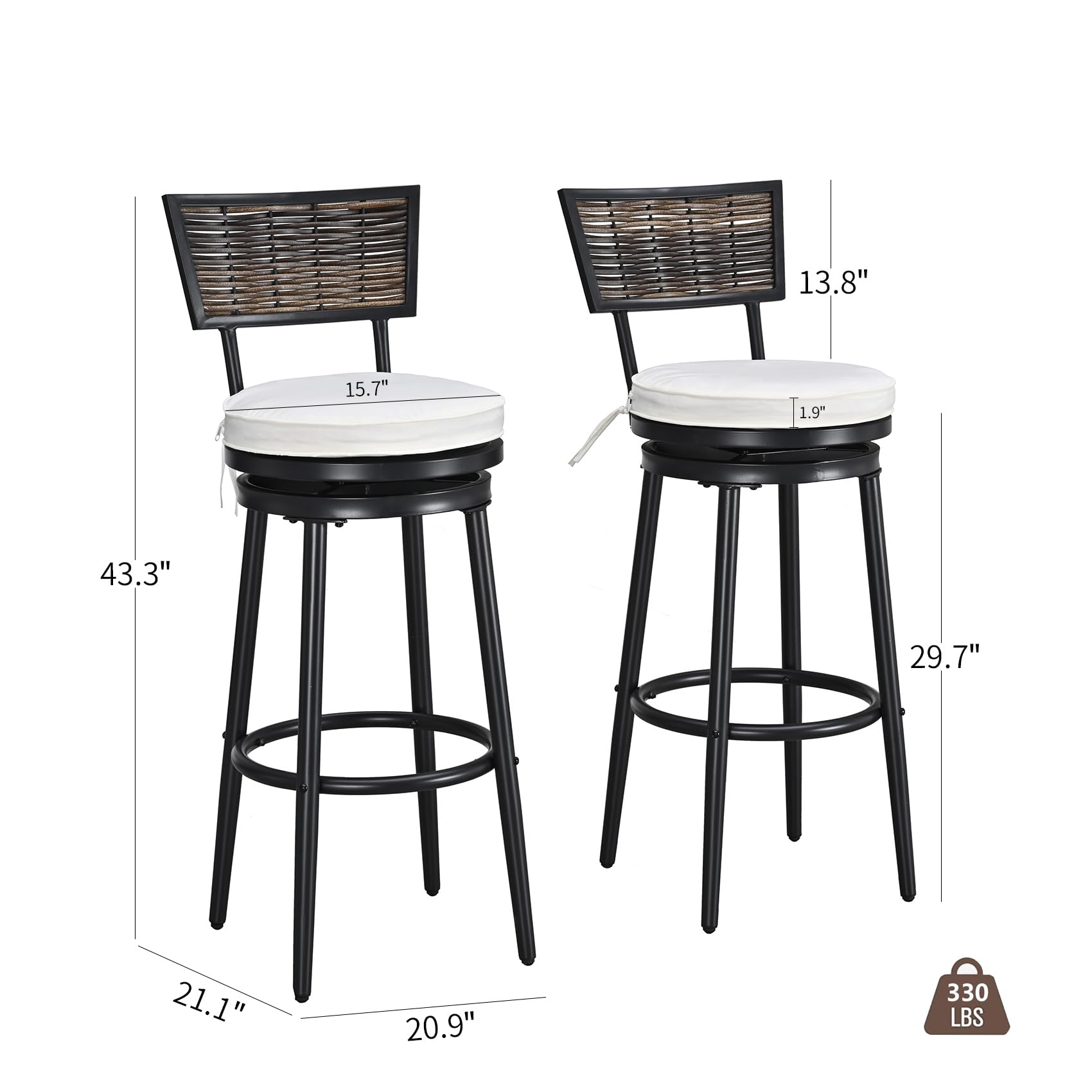 - 360-DEGREE SWIVEL BAR STOOLS: 360-degree swivel function provides extra comfort and relaxation. These outdoor bar stools perform a smooth 360-degree through the swivel mechanism while you enjoy your meal. Set the mood with comfortable and relaxed seating for your patio. Swivel bar stools ensure your safety and give you 2 swing high outdoor chairs. Swing stool dimension(Fully assembled): D20.9*W21.1*H43.3''.