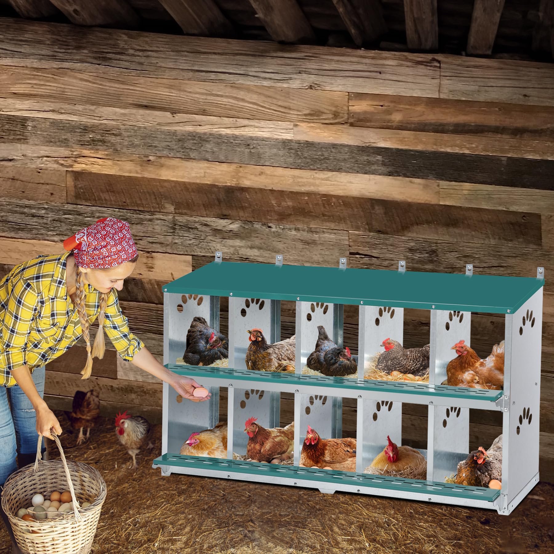 - This metal nest box has a unique design that encourages your hens to lay eggs in the nesting area. The egg box is made of heavy-duty galvanized steel, which is very safe, durable and resistant to collapsing. It keeps the hatched eggs dry and clean, providing a good environment for the hens and improving production.