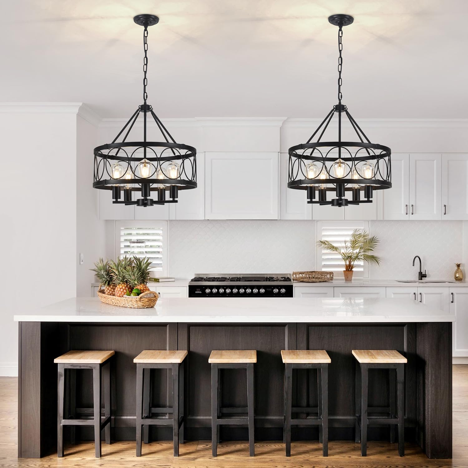 - This iron chain of the kitchen island hanging light is adjustable, allowing you to customize the height to fit your space. The maximum height of the chandelier is 63 inches, it can be mounted on sloping or flat ceilings, making it a versatile choice for any room.