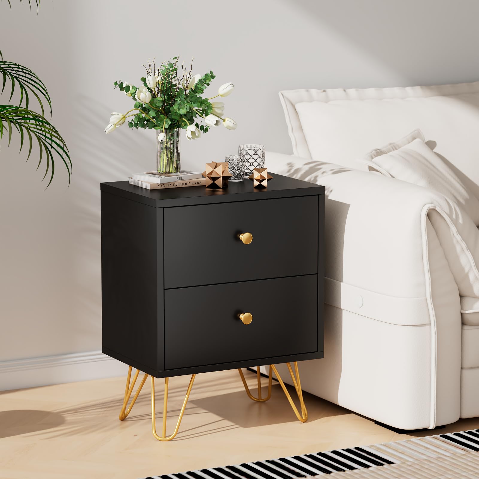 - Sturdy Construction: The bedroom nightstand is made of high-quality engineered wood, Scratch-resistant, waterproof, strong and durable. The solid construction gives the black and gold nightstand high stability and strong load bearing that can hold up to 60 lbs. Four metal feet provide strong support for the mini 2 drawer dresser.