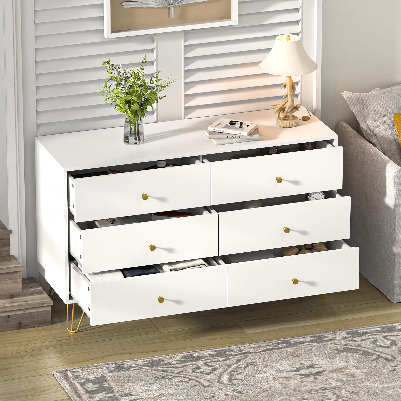 White Dresser for Bedroom, 6 Drawer Dresser with Golden Handles and Golden Legs