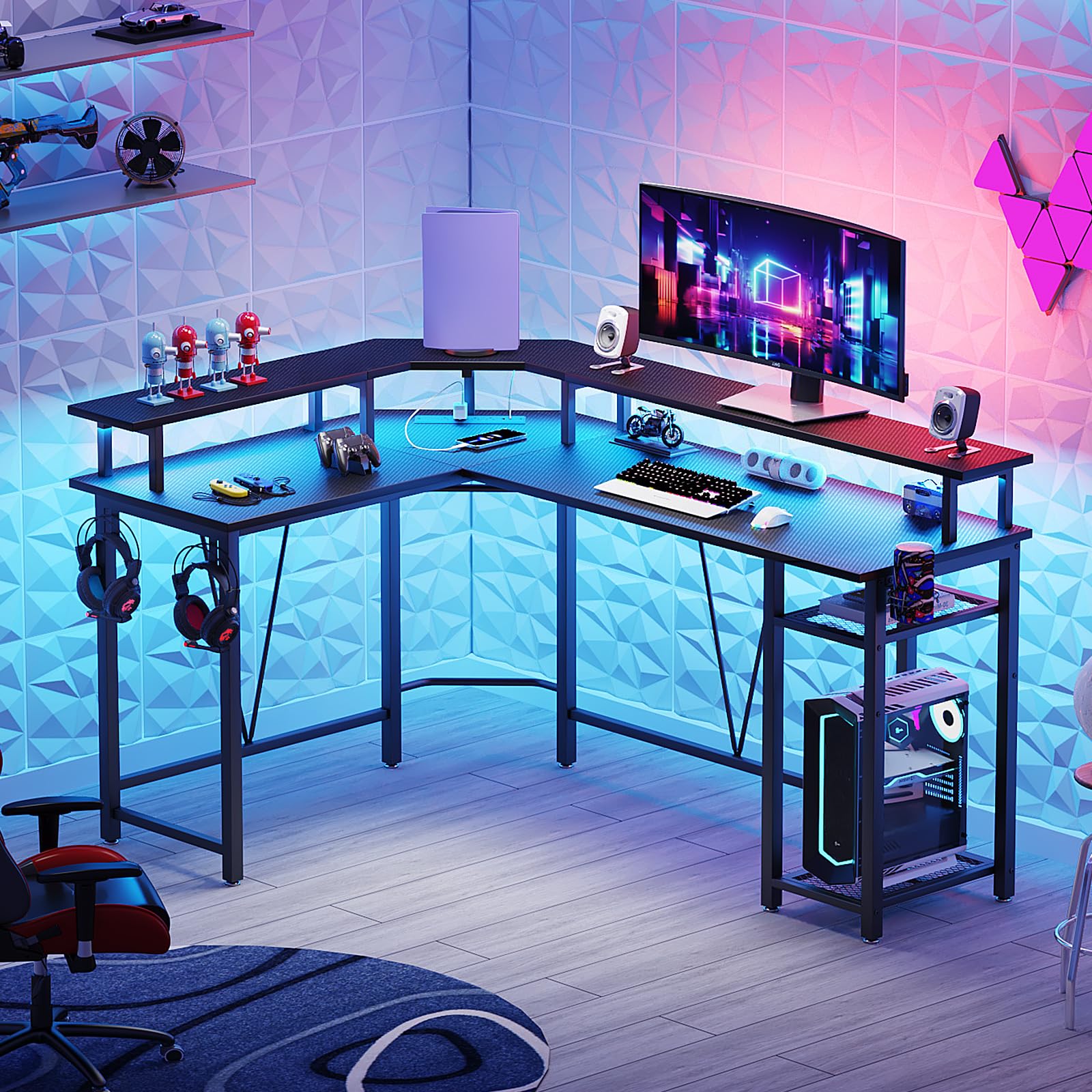 L Shaped Gaming Desk with Power Outlet&Music Strip Lights, Corner Desk with 2-Layer