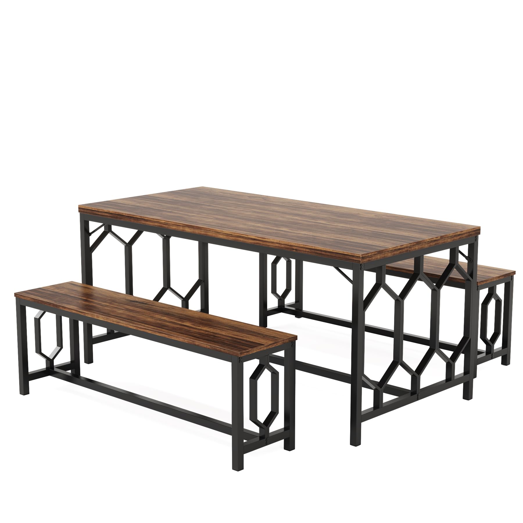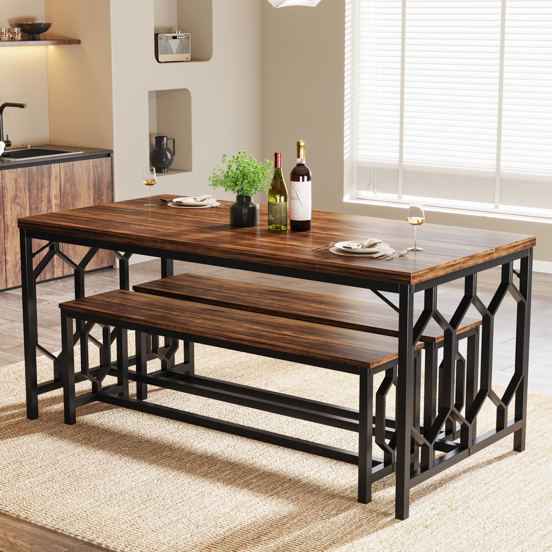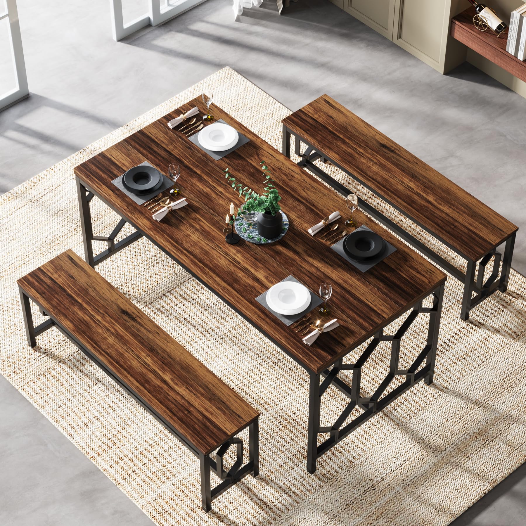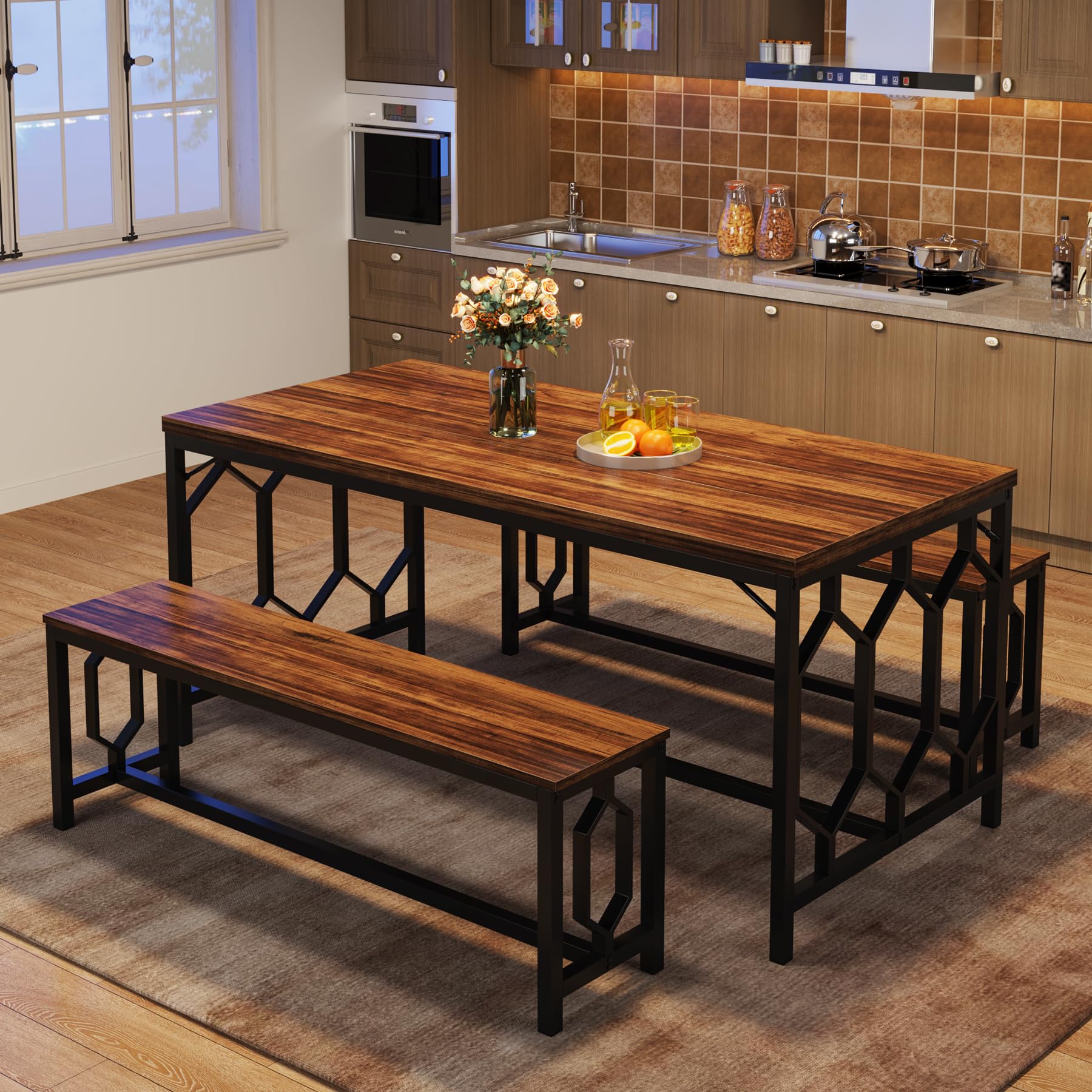 Tribesigns 55-Inch Large Dining Table Set for 4 to 6, Kitchen Breakfast Table with 2 Benches, Rectangular 3-Piece Wood Modern Industrial Bar Table Furniture for Dining Room, Rustic Brown & Black