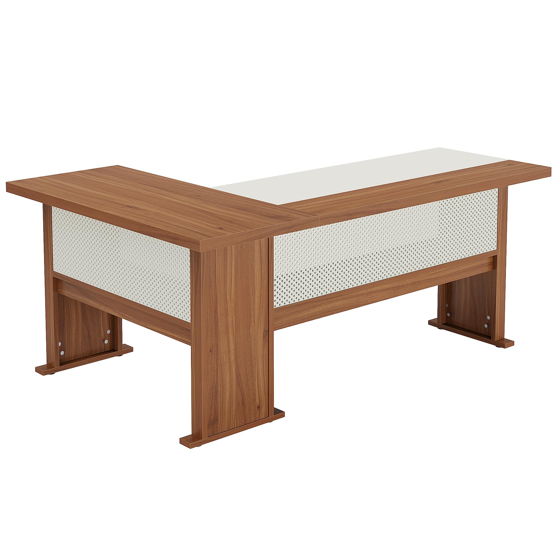 - Add a contemporary touch to your workspace with our ornate L-shaped desk. A rustic brown wood grain tabletop combined with a stylish white patchwork finish adds to its modern charm and enhances any home office, study area, playroom, or workspace.