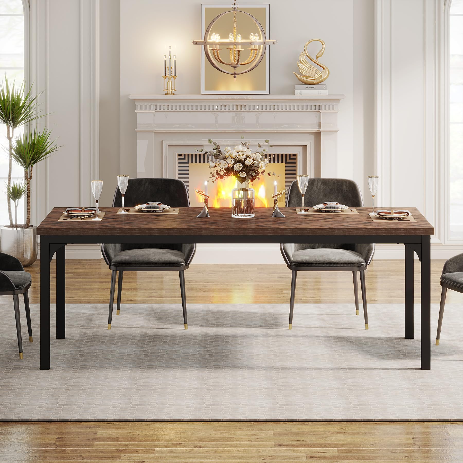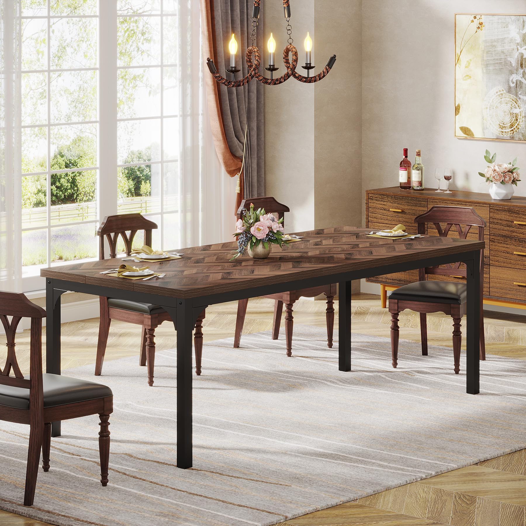 - INDUSTRIAL CHIC: With sleek industrial style and clean lines, this farmhouse-inspired dining table makes your mealtime marvelous and warm. Rustic brown tabletop with symmetric grains and matte black metal legs have a stylish and eye-catching contrast, and create a endless rustic chic and charming warm vibe to your dining space.