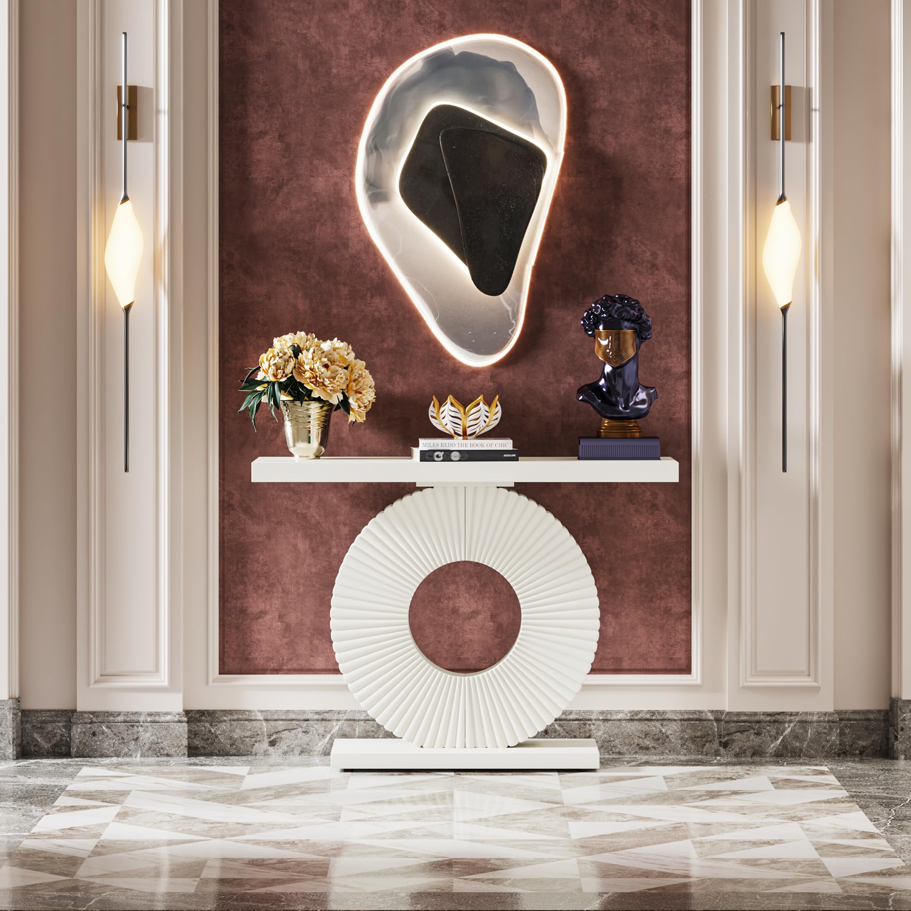 - This contemporary console table showcases an circular flower shape base with curved lines accents that pair seamlessly with clean tabletop for a minimalist glam look. With a striking geometric design for a touch of impeccable style, this table will be sure to enliven any space. From an entryway to living room and beyond, the entryway table offers room to display decor pieces while also clearing up clutter.