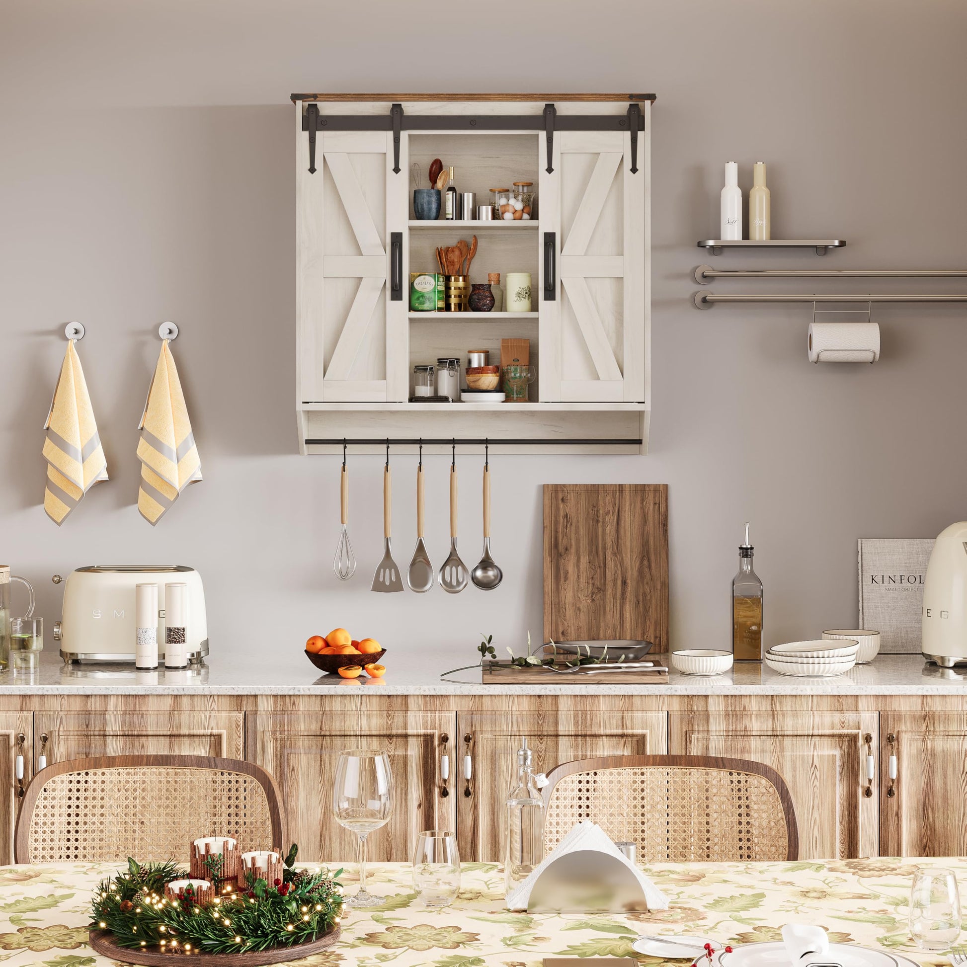 - Vintage Farmhouse Design. This wall-mounted cabinet has a rustic charm look with its farmhouse board texture and vintage inspired details,adding a rustic country atmosphere to your home. 2 barn doors can slide smoothly to meet your hidden storage and open storage needs at the same time.