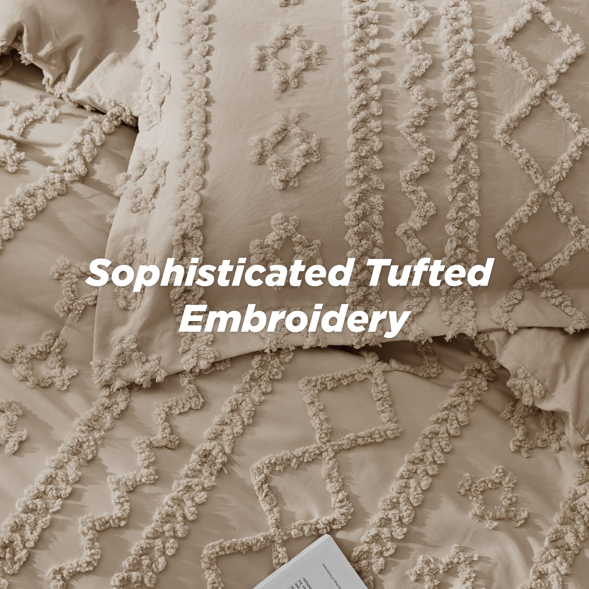 Transform your bedroom into a serene sanctuary with this elegant tufted boho comforter set. Featuring intricate embroidery and a sophisticated khaki tone, this farmhouse-inspired bedding combines timeless design with exceptional comfort. The GentleSoft™ jacquard fabric delivers a luxuriously soft touch while maintaining durability for year-round use.