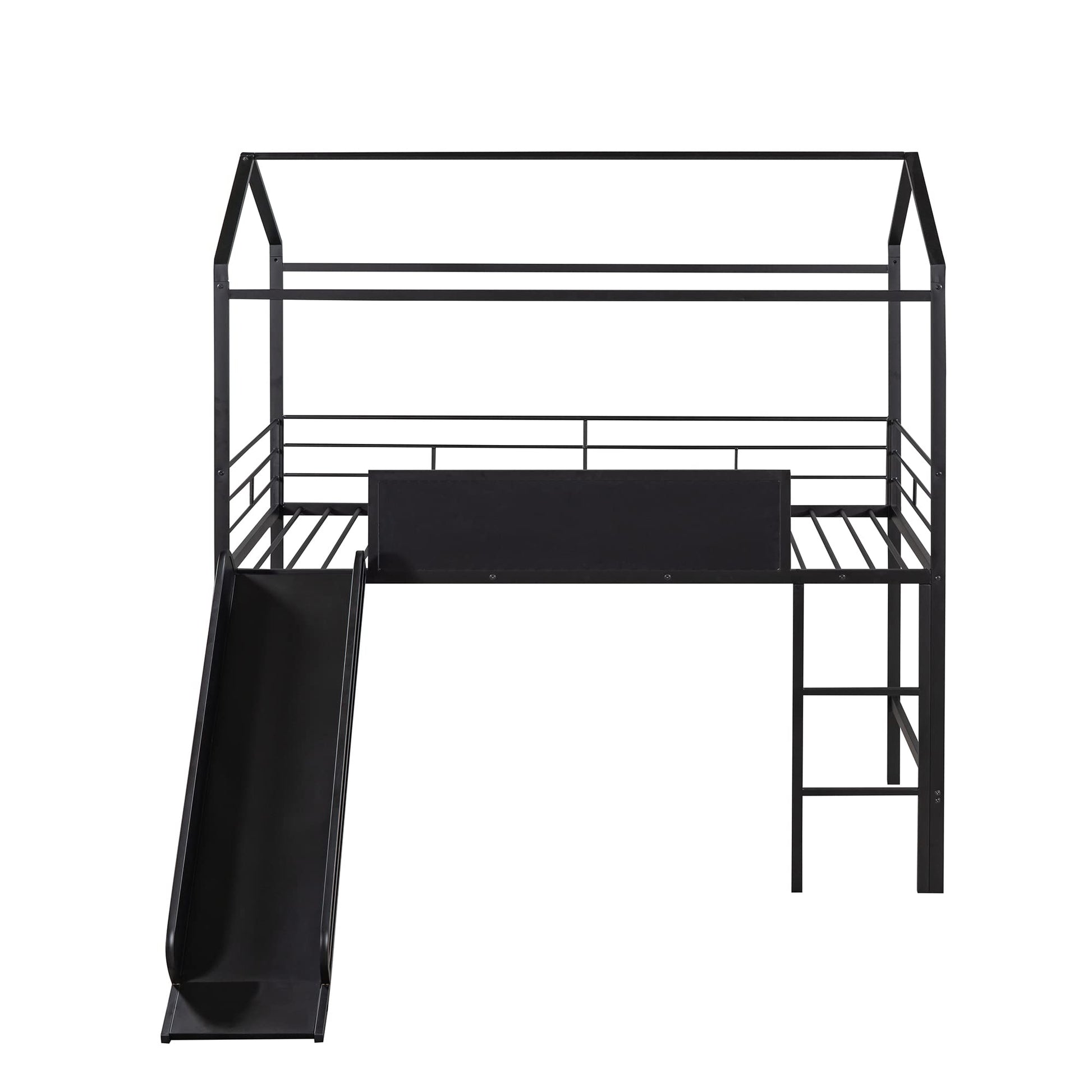 Slide and Chalkboard, Low Loft Bed Twin Size, Metal House Bed with Guardrail and Ladder, Metal Twin Size Loft Bed for Kids Teens Girls Boys (Twin, Black)
