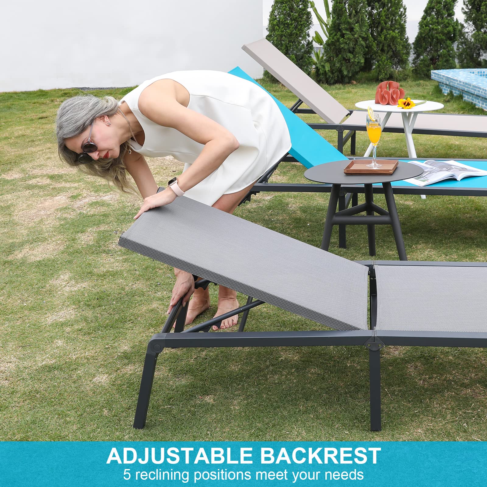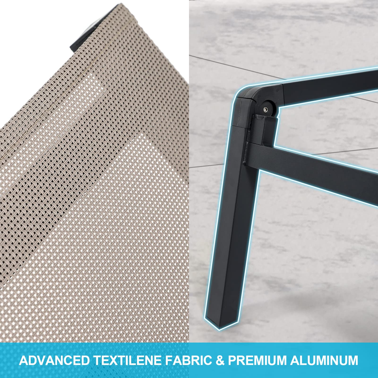 - Rust-Free Aluminum Frame Chaise Lounge Outdoor: poolside lounger chaise frame is completely made of premium aluminum which is rust-free and deformed-free. The pool lounger seating is made of advanced textilene fabric which is breathable, water and oil-proof for easy care.