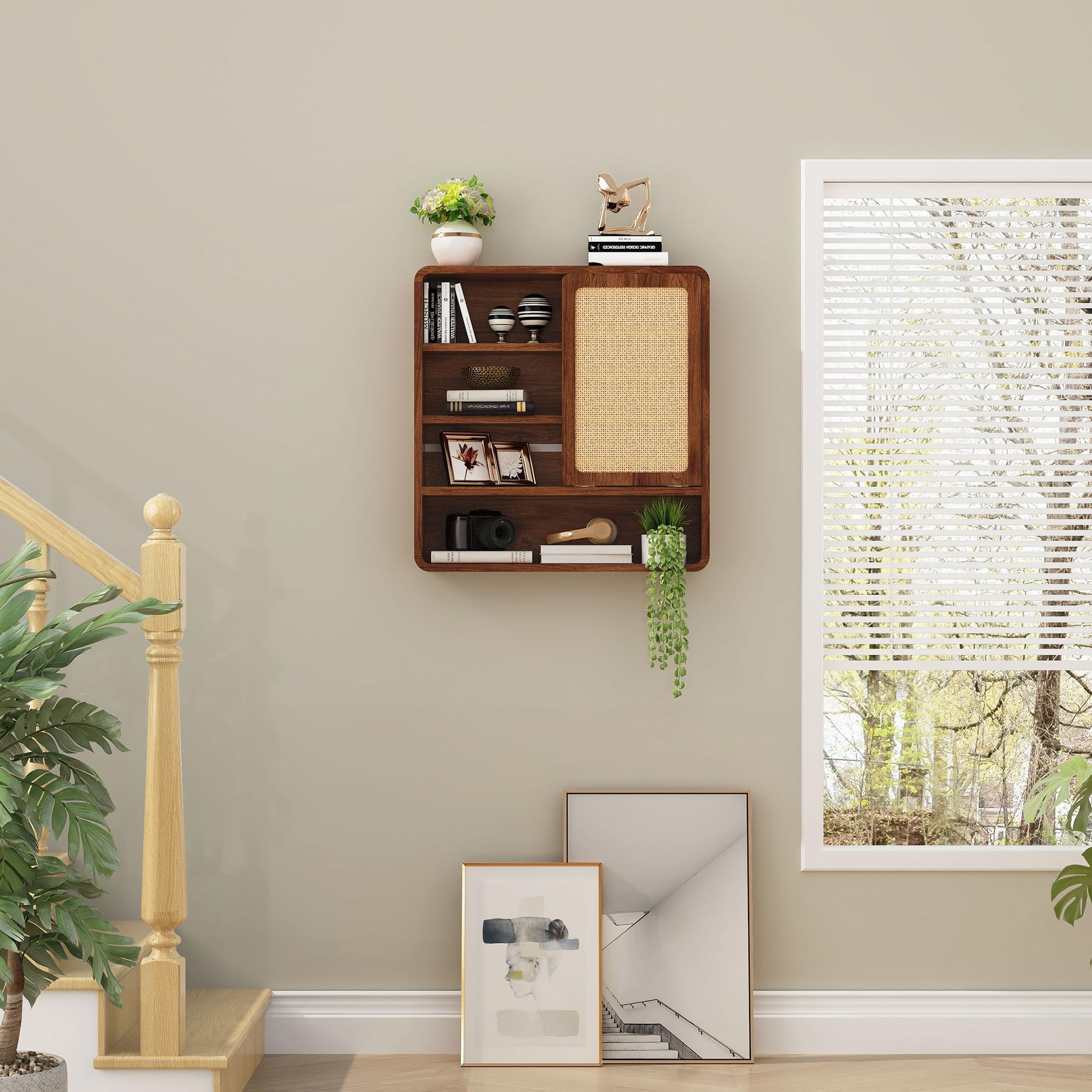 - Measuring 5.12"D × 22.05"W × 22.83"H. The bathroom hanging cabinet adopts Flax sliding door design, adding a boho style. Featuring a sliding door, adjustable shelf, and a semi-open bottom compartment. From towels to shampoo and other toiletries, everything finds its place in this chic cabinet, ensuring your space stays tidy and organized.