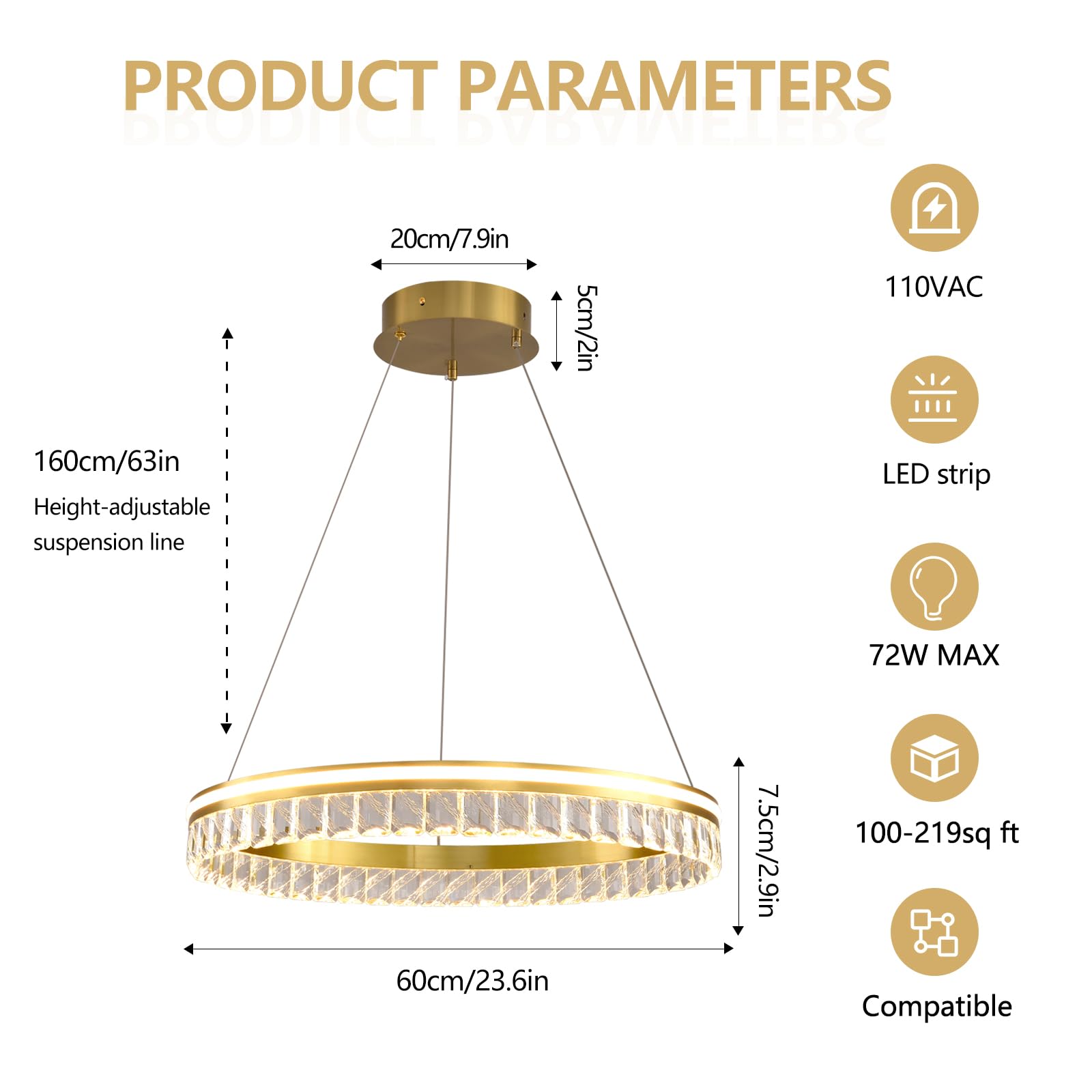- Cable length max63"/160cm(adjustable). Lamp body diameter:15.75"/40cm,Height:3"/7.5cm.Power: 72W,Light source: LED strip, environmental protection and energy saving, no flicker, eye protection.