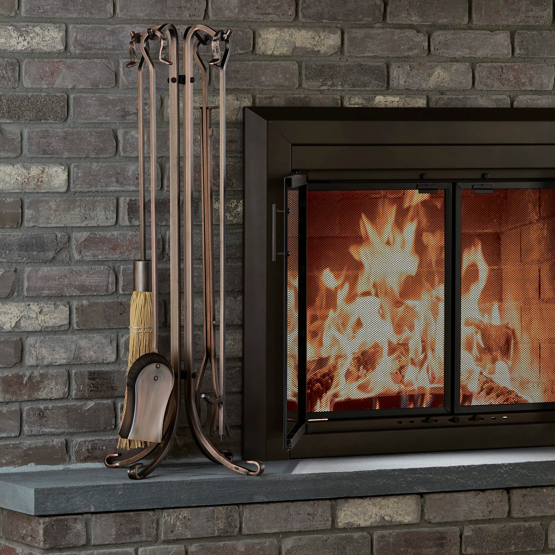 - 5-IN-ONE COMPLETE SET: Decorative and beautiful, this fireplace accessories set can meet all your needs to tend to your fireplace. This tool set includes sturdy stand, brush broom, antique shovel, tong, and log lifter. The integrated hook on the frame makes each tool hang in order, which looks tidy and fits into most design motifs.