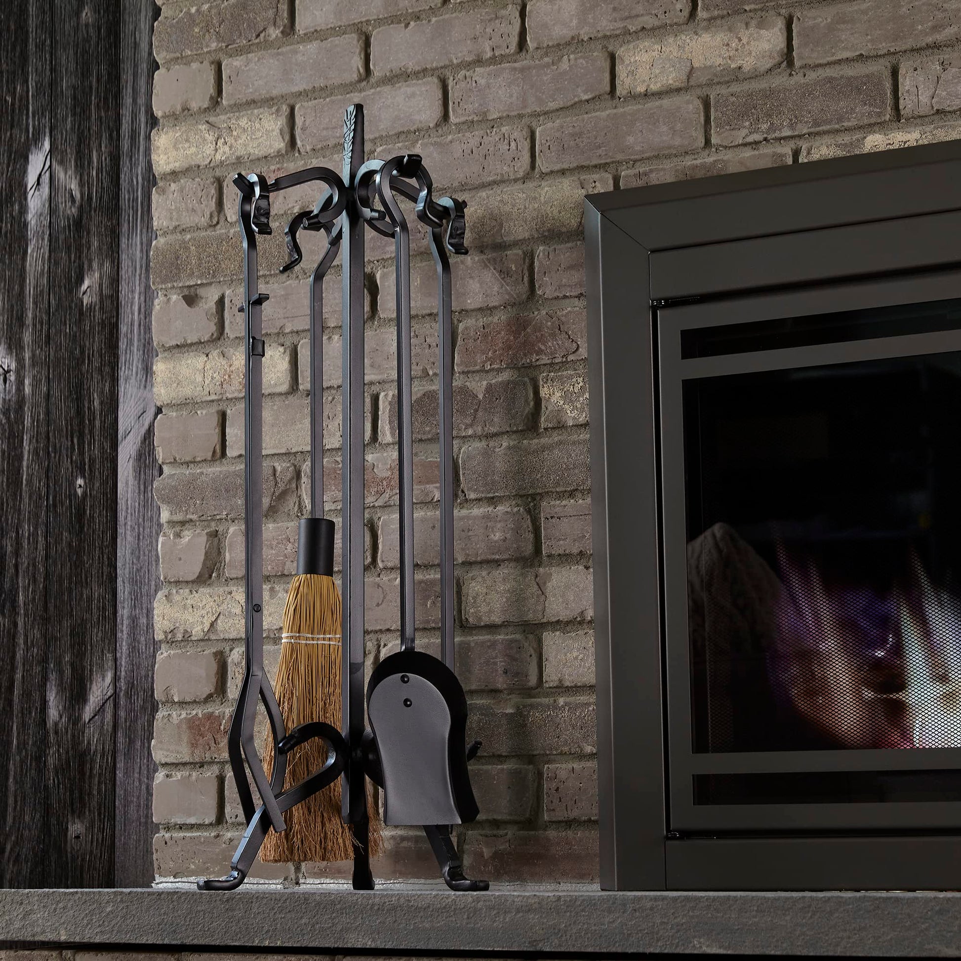 - 5-IN-ONE COMPLETE SET: Decorative and beautiful, this fireplace accessories set can meet all your needs to tend to your fireplace. This tool set includes sturdy stand, brush broom, shovel, and poker. The handles hook easily on stand, which looks tidy and fits into most design motifs.