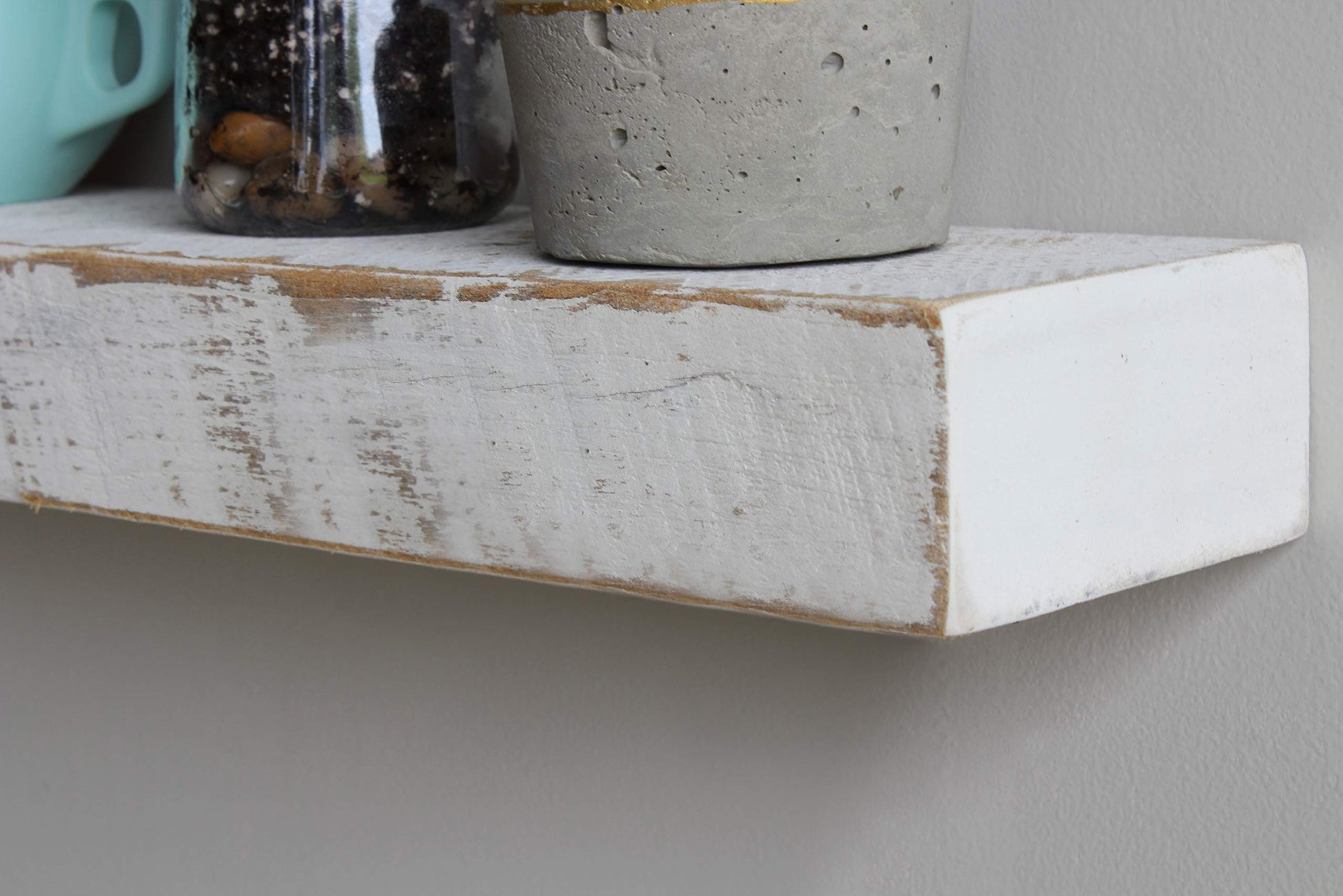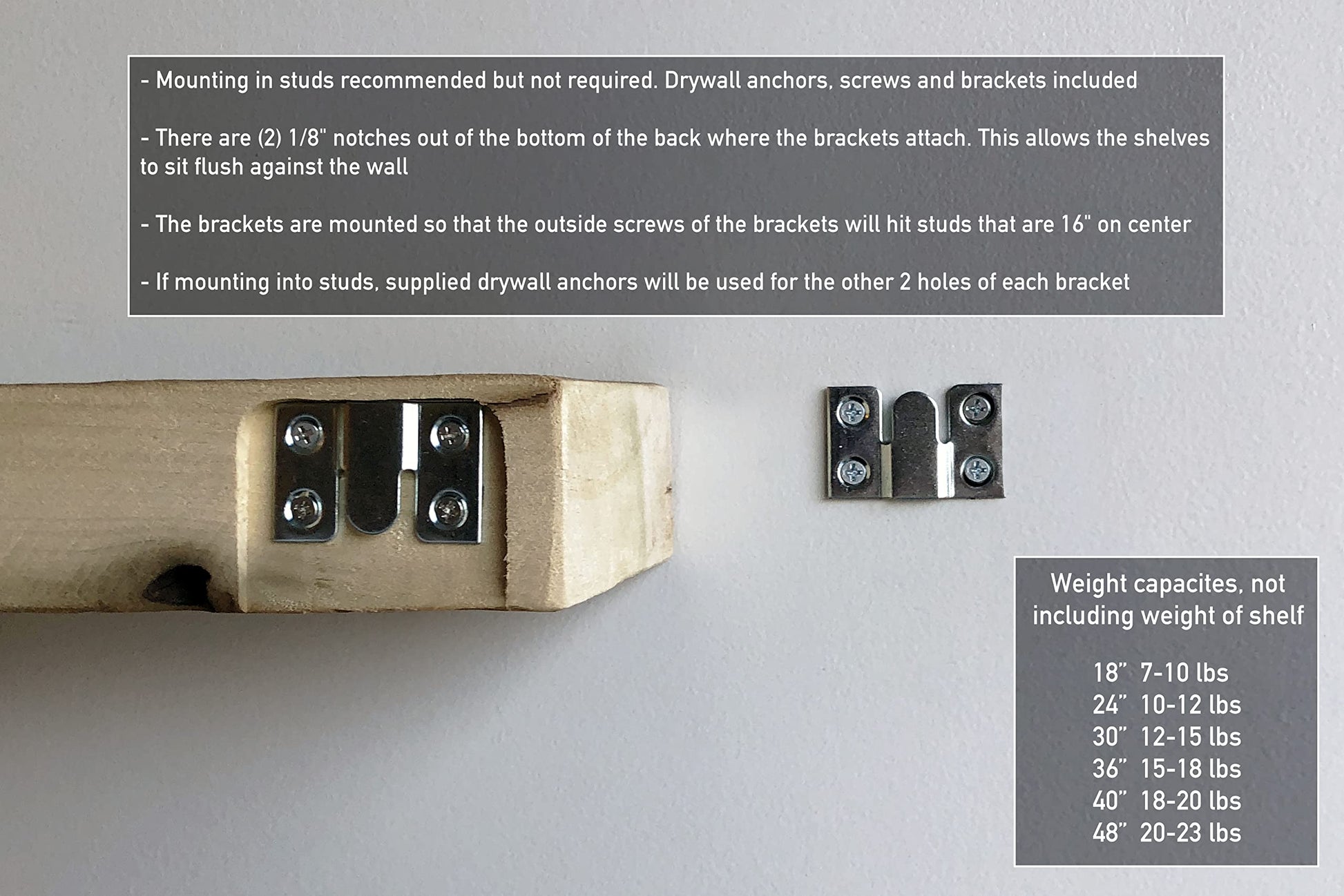 - Set of 2 Accent Floating Shelves and Flush Mount Floating Brackets. The shelves are finished with a white washed look. Color may vary (please see all pictures). Each shelf measures 24” long x 4.5” deep x 2" thick (nominal measurements). Each shelf weighs approximately 4 lbs and can support up to 12 additional lbs