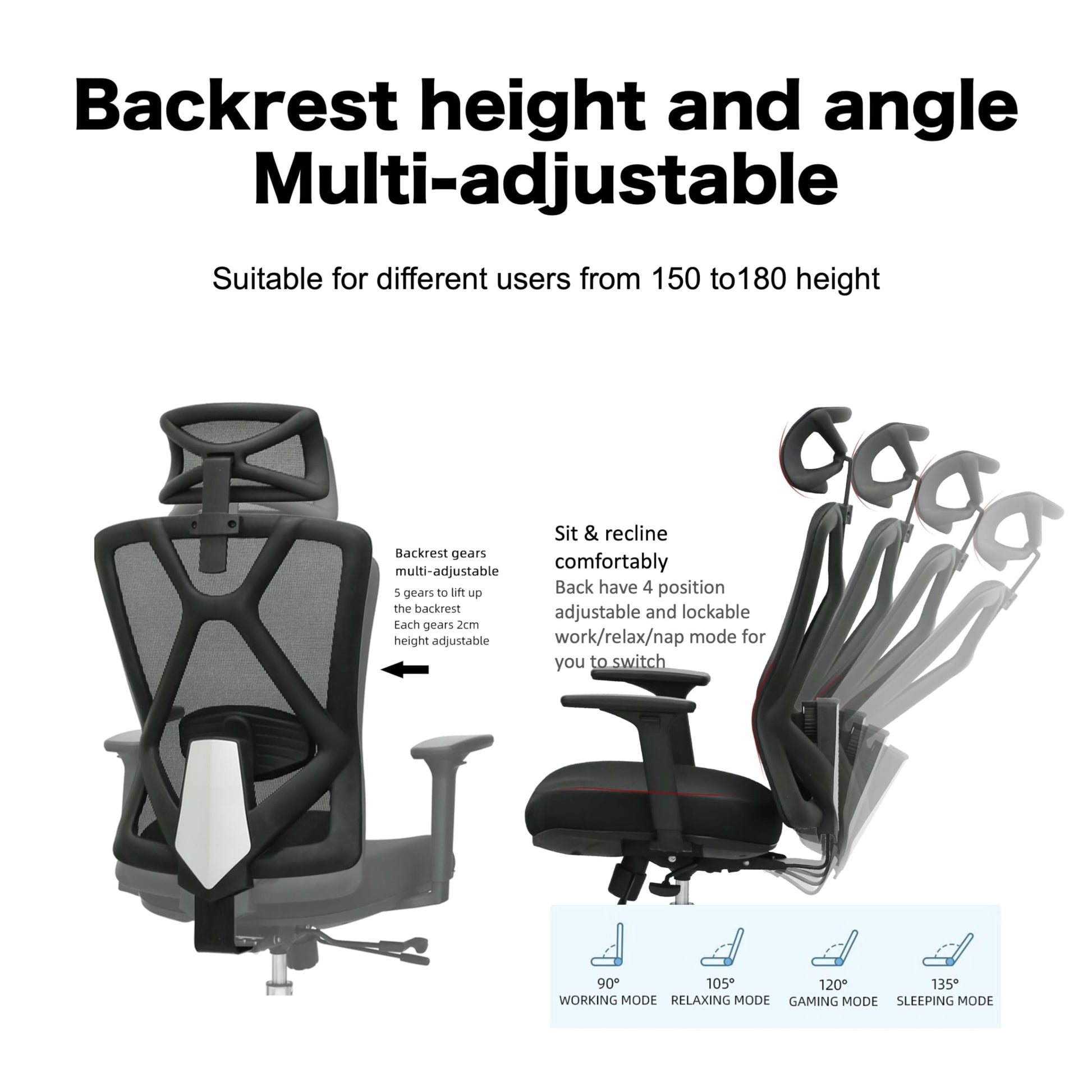 - Backrest gears multi-adiustable, 5 gears to lift up the backrest, each gears 2cm. Suitable for different users from 150 to 180CM height.