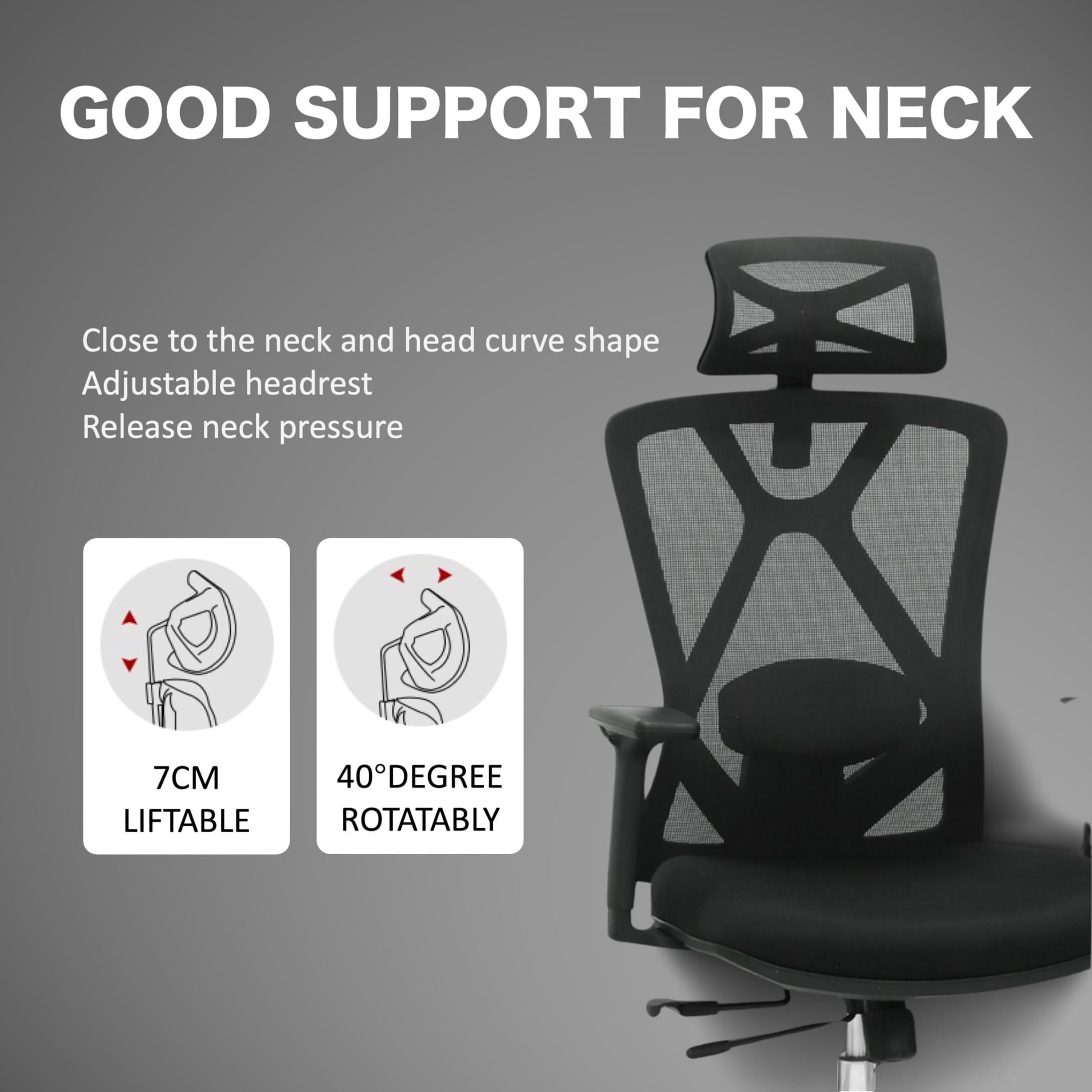 - Close to the neck and head curve shape. Release neck pressure.7CM liftable, 40° rotatably.