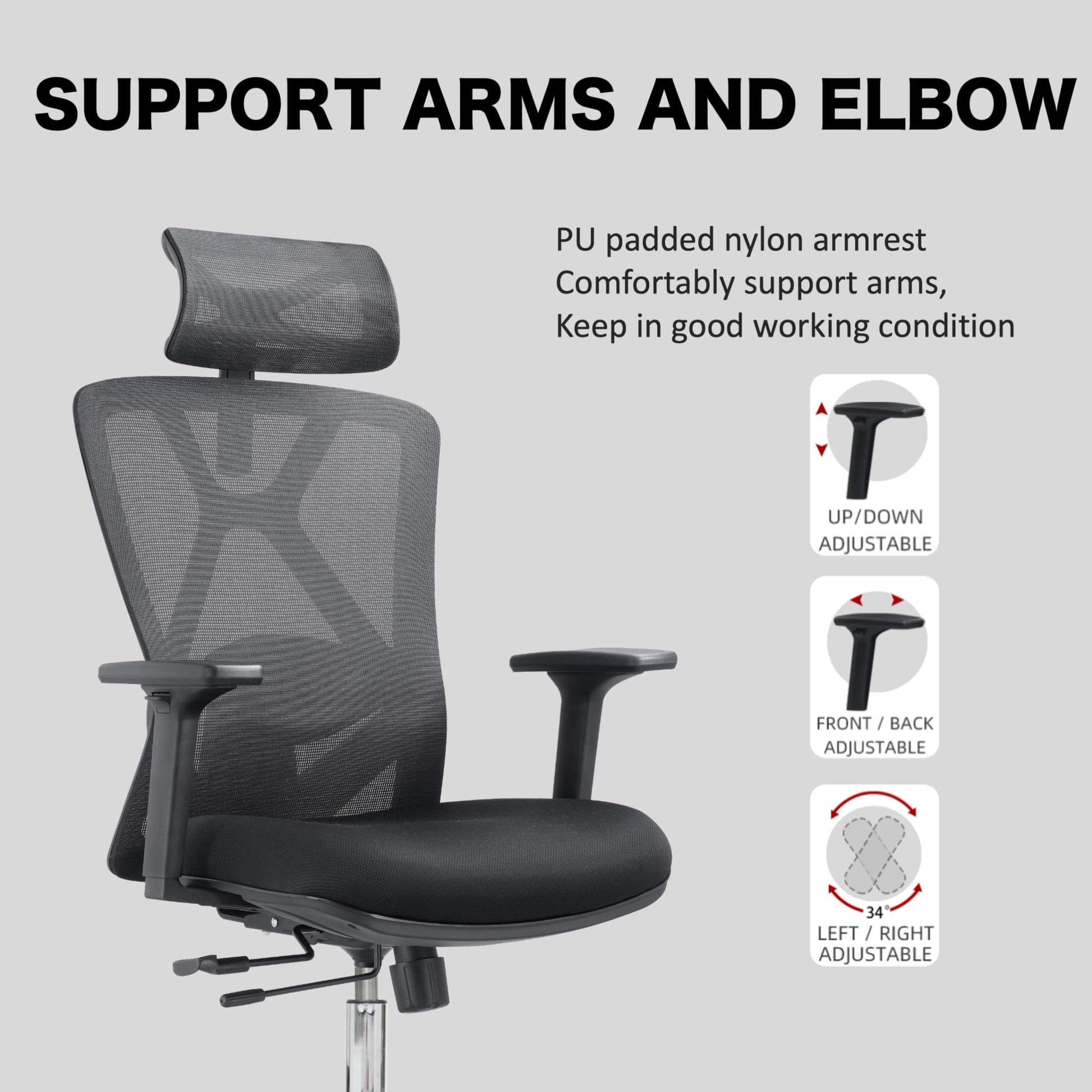 - Comfortably support arms, keep in good working condition. Up/Down Adjustable, front / Back Adjustable, 34° Left / Right Adjustable.