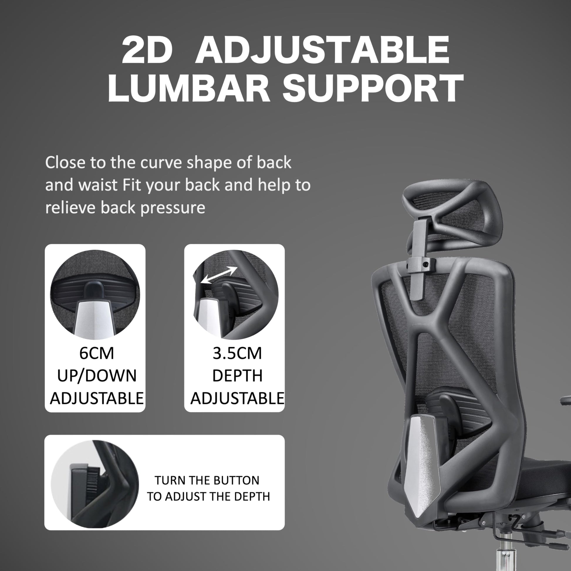 - Close to the curve shape of back and waist Fit your back and help to relieve back pressure. Up/Down Adjustable, turn the button adjust the Lumbar depth.