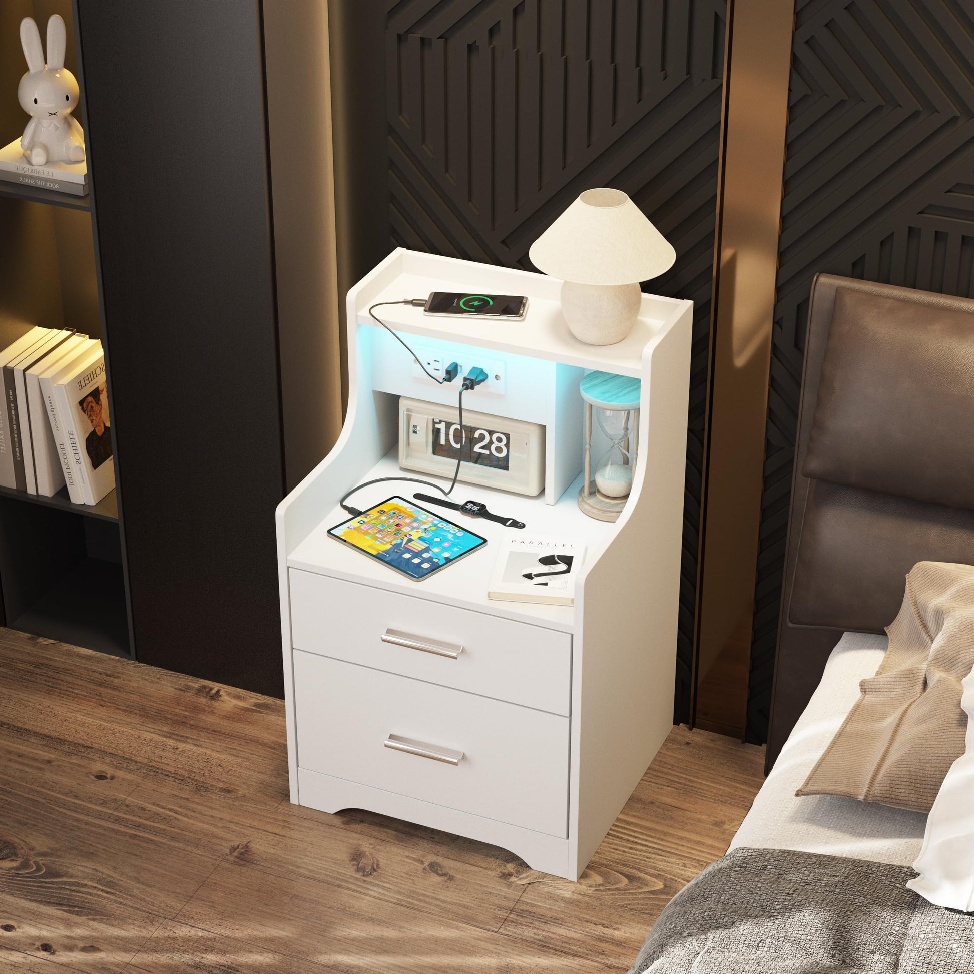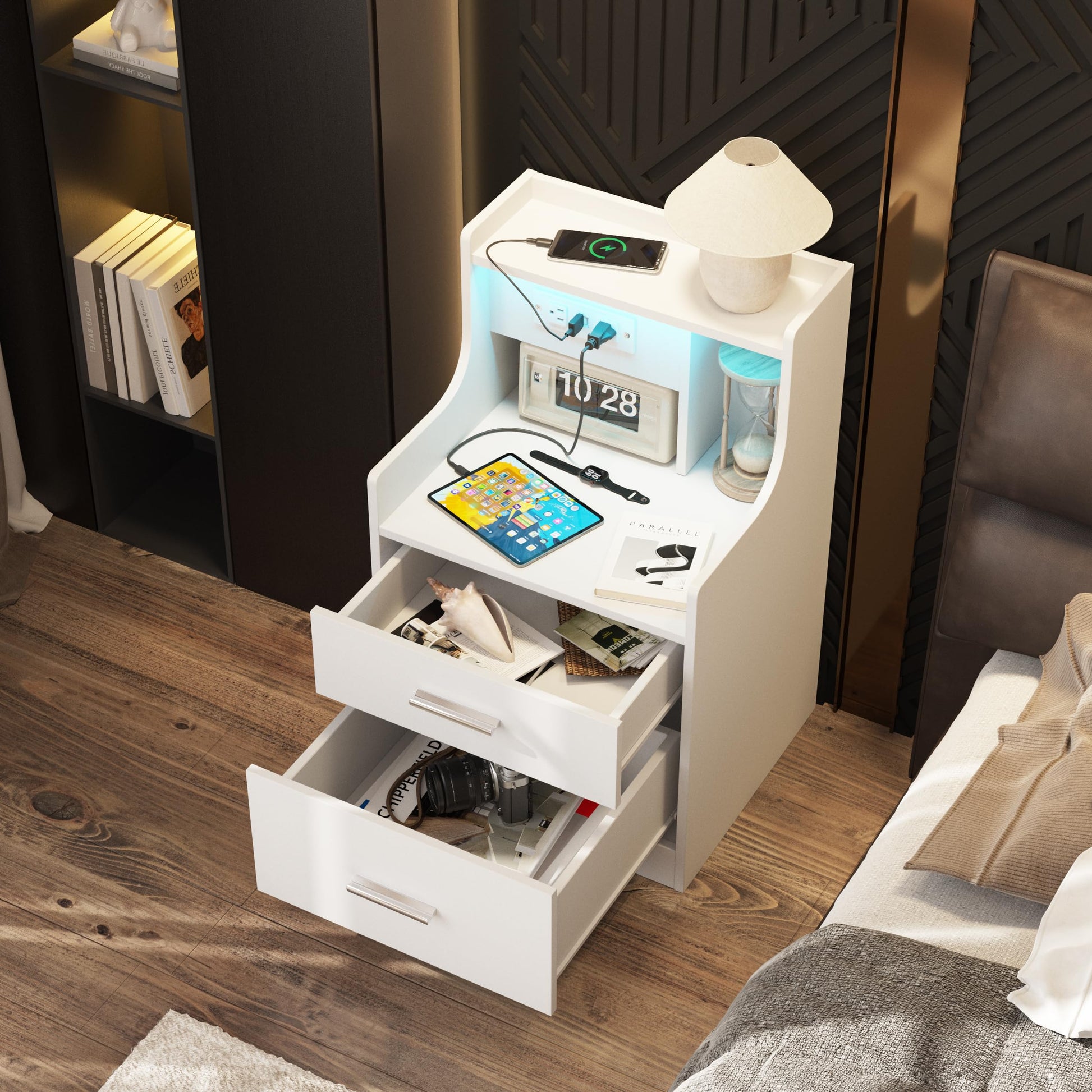 Nightstand with Charging Station & LED Lights, White Nightstand with 2 Drawers and Open Storage