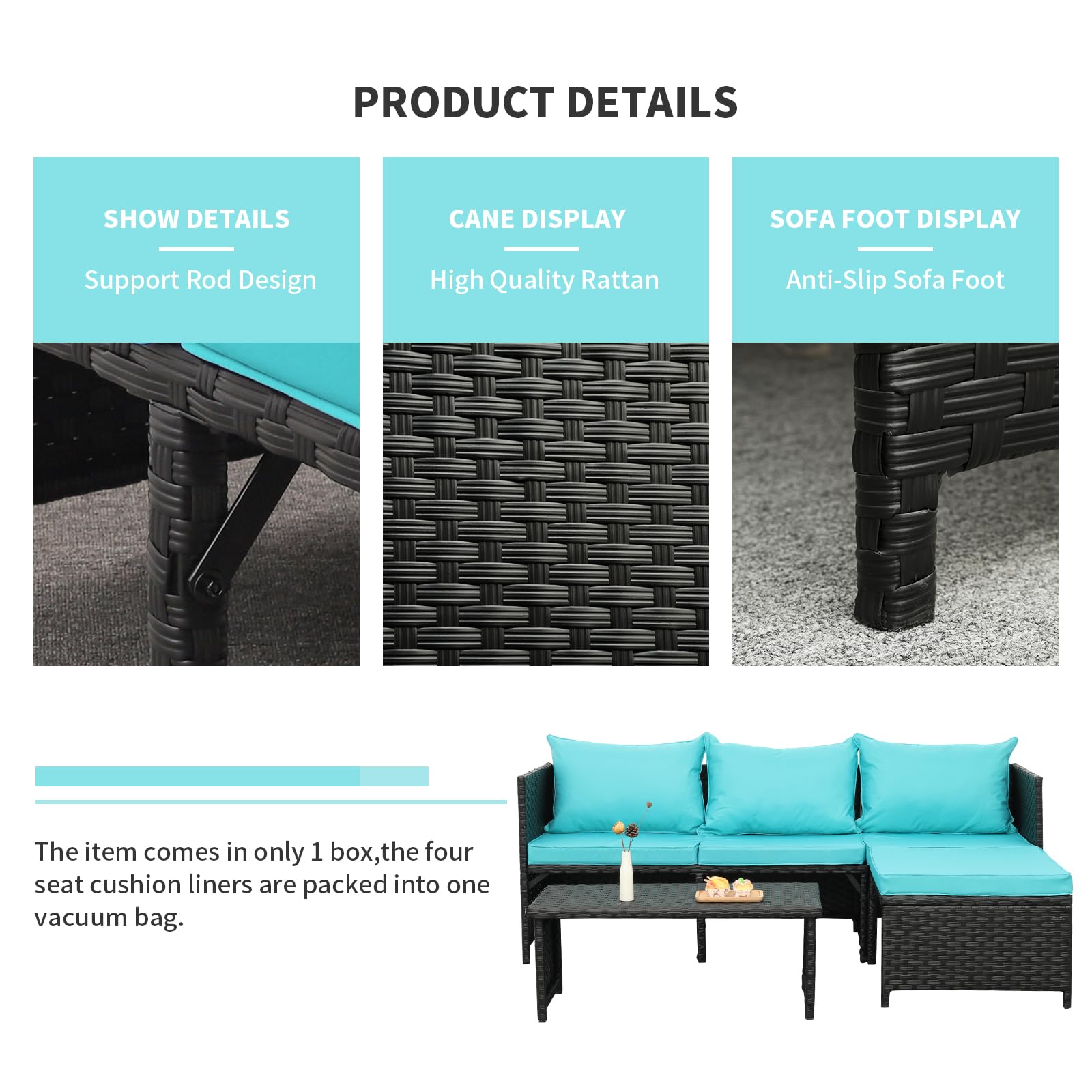 - SUPPORT ROD DESIGN: This outdoor conversation furniture is built with an anti-rust steel frame and all-weather PE rattan; the support rods are used in the middle of the loveseat and the middle of the lounge sofa, which can effectively reinforce the load-bearing function, making the set more durable、stable and comfortable.