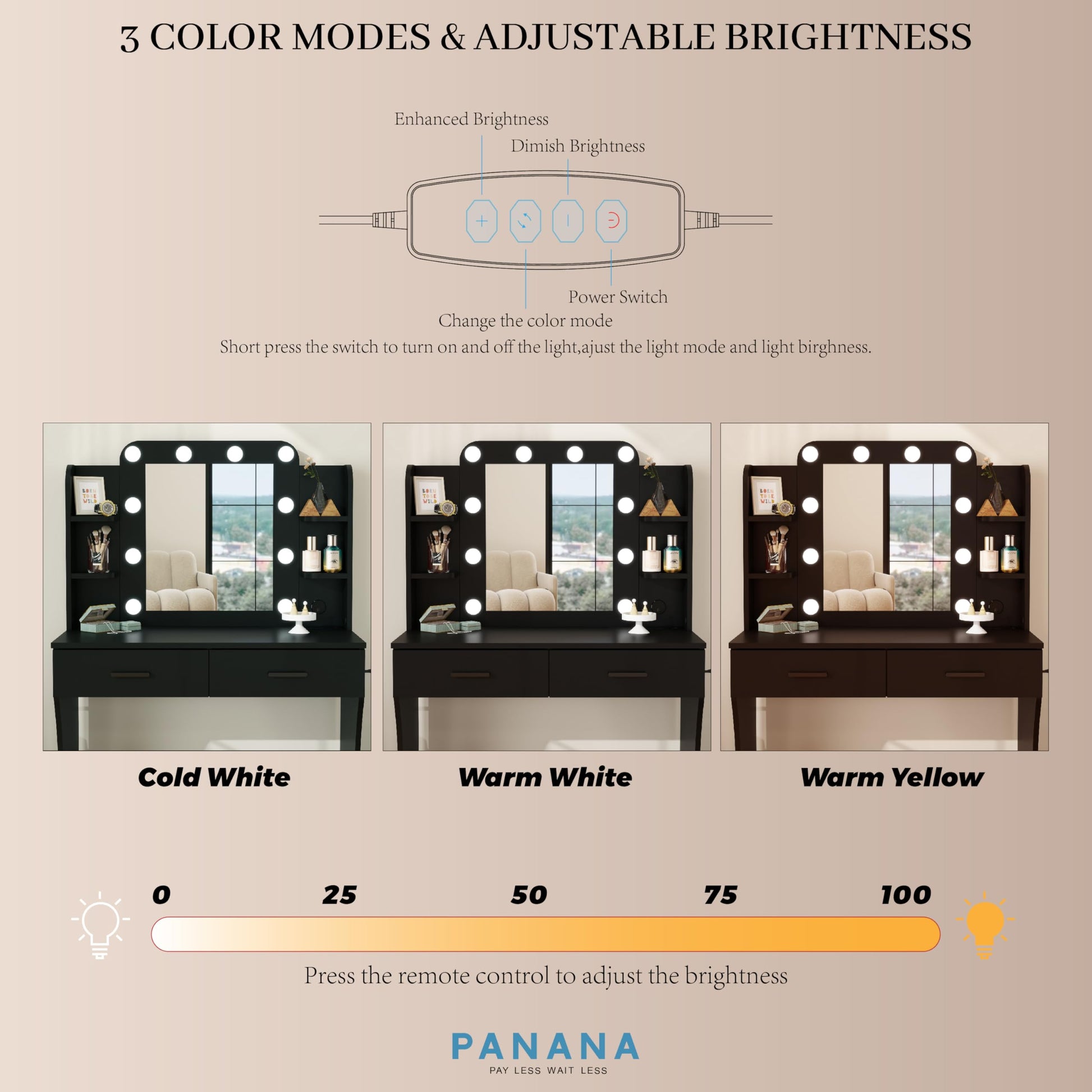 - Hollywood-Style Mirror with Adjustable Lighting: The vanity is equipped with a large mirror framed by 10 Hollywood-style bulbs that offer three lighting modes: warm white, natural light, and cool white. Each light mode’s brightness is adjustable, allowing you to create the perfect ambiance for makeup application, skincare routines, or simply getting ready for the day.