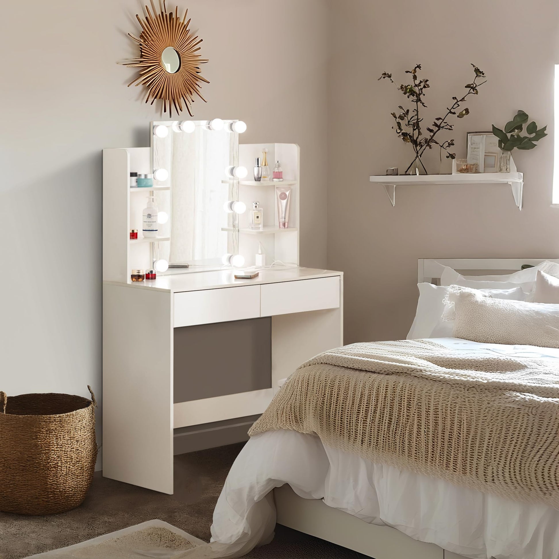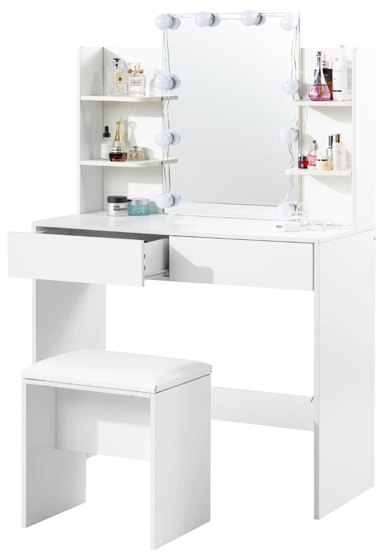 - Ample Storage Space: Equipped with 2 spacious drawers and storage shelves to organize makeup, skincare, and accessories.