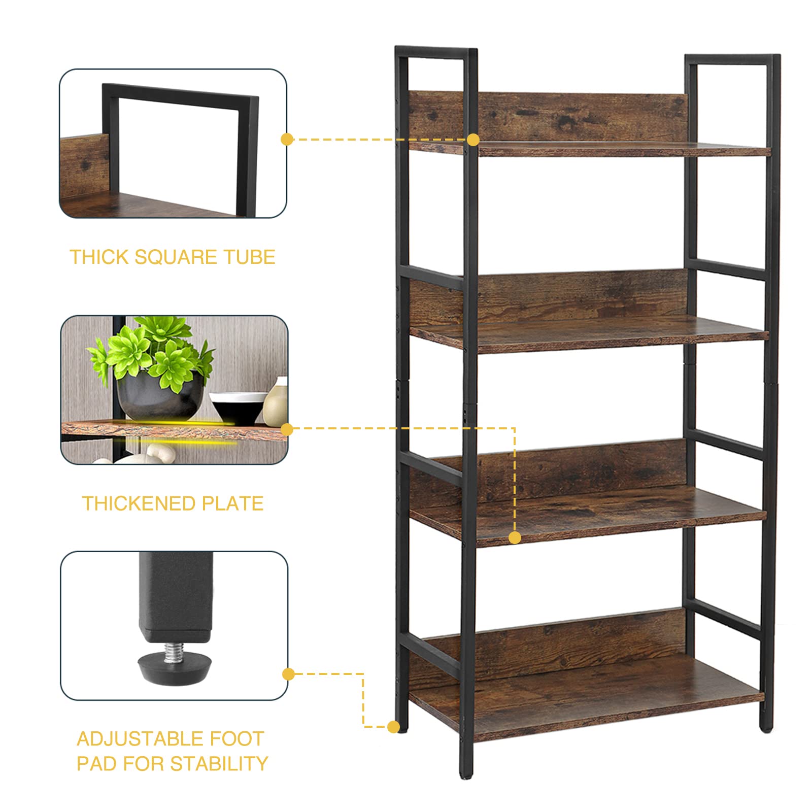 - Bookshelf with sturdy metal frame and sturdy shelves, 4 protective feet make sure it stands firmly while protecting your floor from scratches. The back panel keeps things from falling off the shelf. The whole structure is more stable