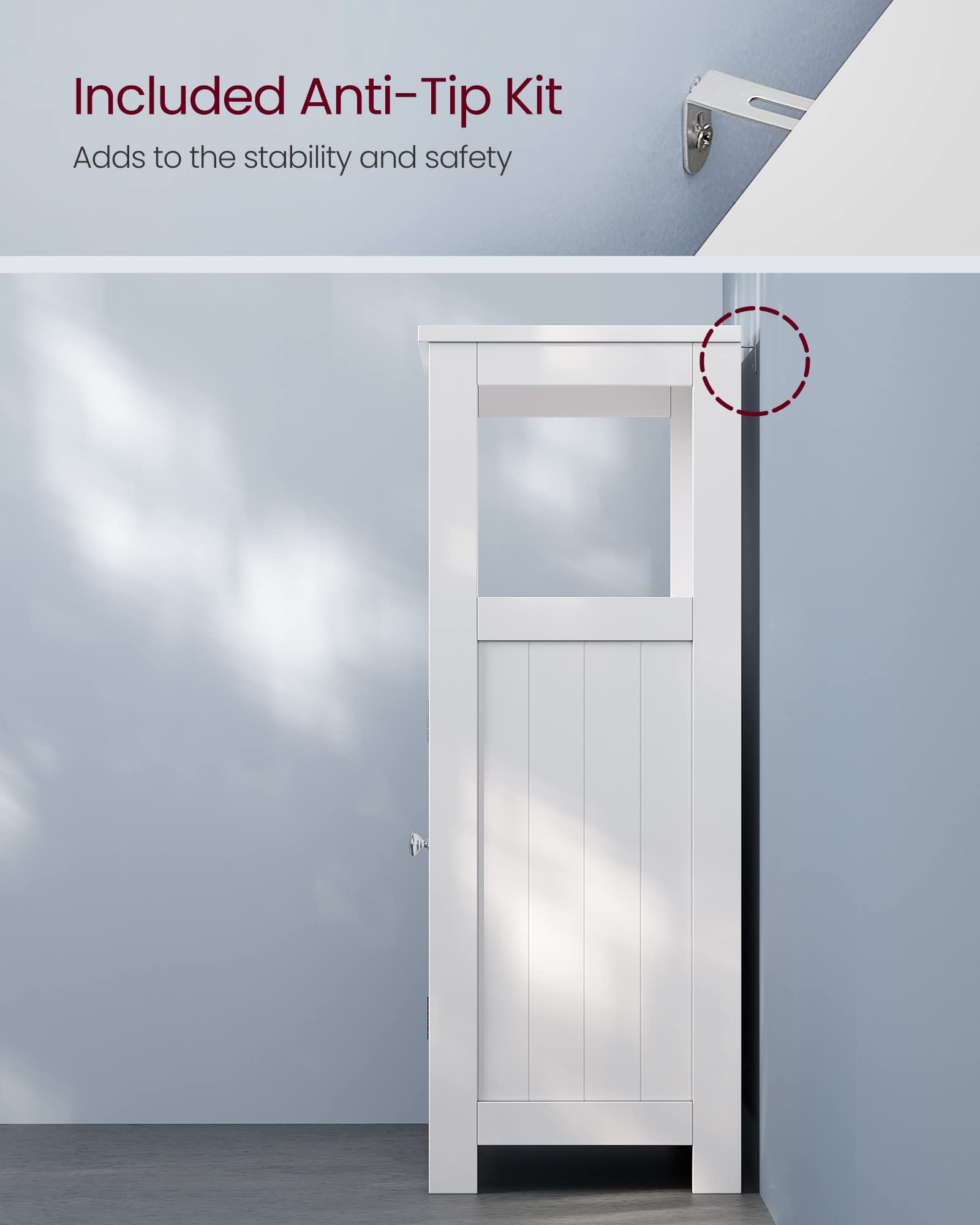 - [Sturdy and Stable] Made with premium MDF, this freestanding bathroom cabinet is sturdy enough to withstand the test of time. The included anti-tip kit secures the cabinet to the wall for added stability and safety
