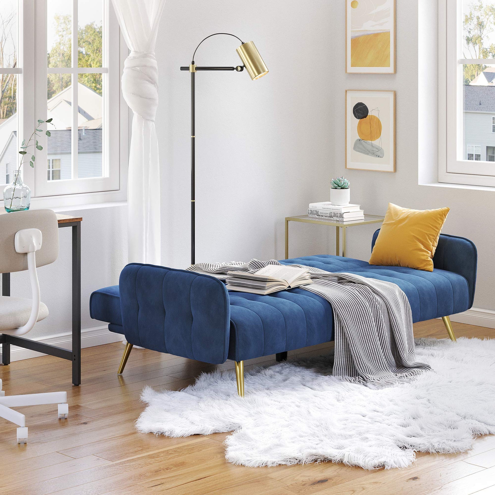 - Your Sofa, Your Call: Add a splash of elegance to your home (and life!) with this sofa bed featuring graceful contours, a tufted design, and an inviting blue color—set it in the living room, home office, or compact apartment, the perfect fit!