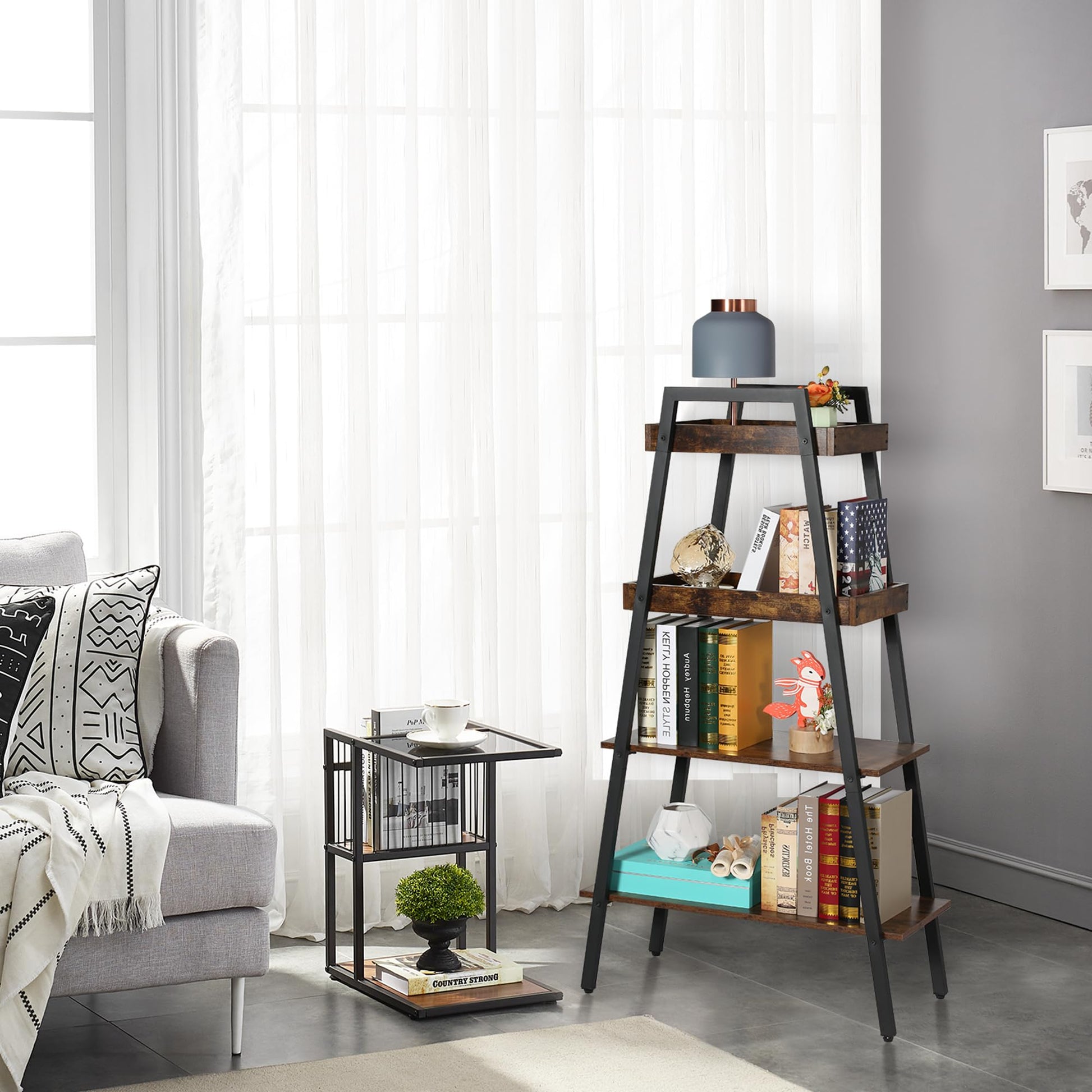 - [Simple Industrial Style] This 4-tier ladder bookshelf features a simple design, combining high-quality rustic brown wood panels with a metal frame. This freestanding display shelf can be placed in the bedroom, living room, kitchen, study, balcony, or entryway.