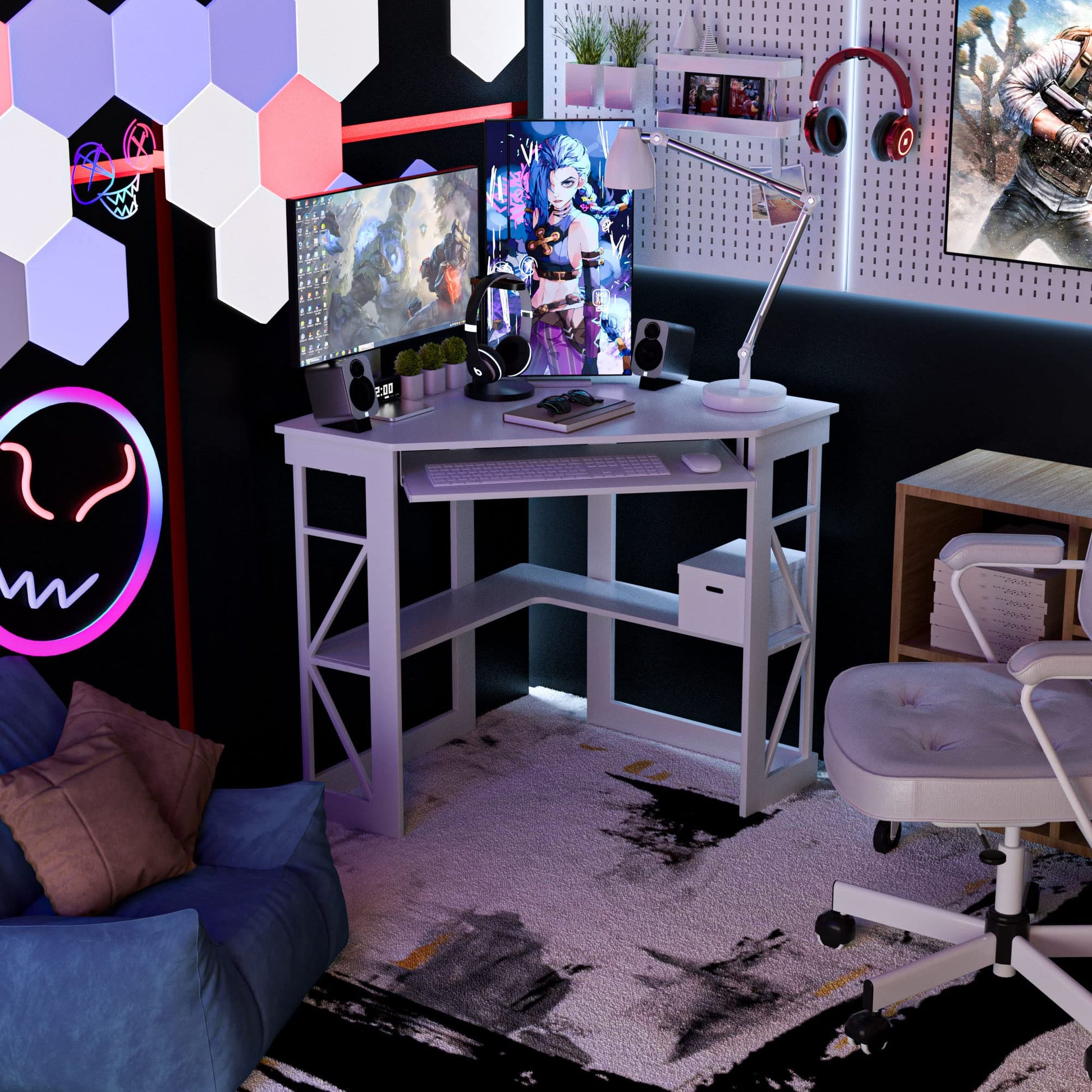 - Corner desk with keyboard tray and two open shelves on the side provides working space and extra plenty of storage space.