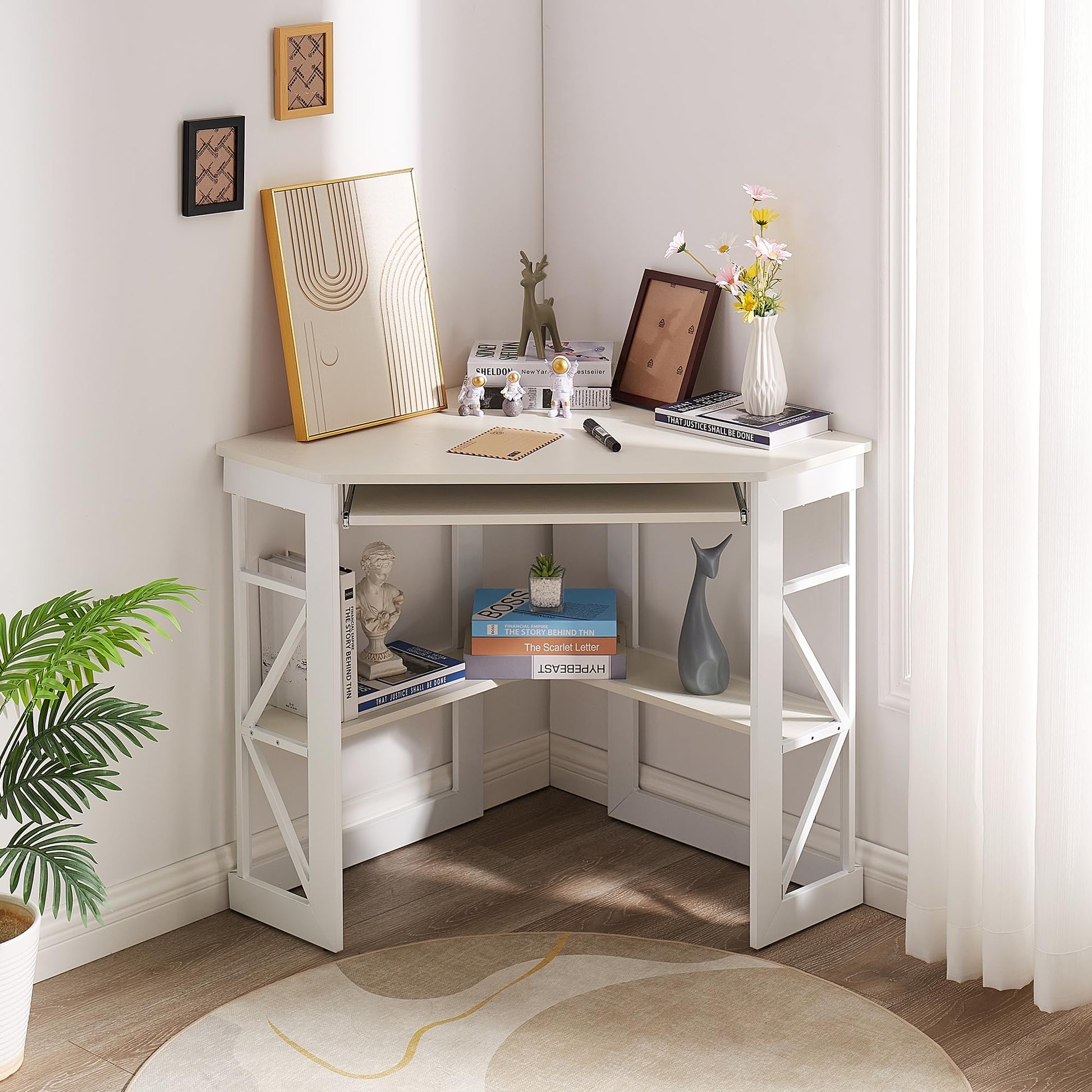 Corner Computer Desk Writing Smooth Keyboard Tray & Storage Shelves,Compact Home Office Triangle