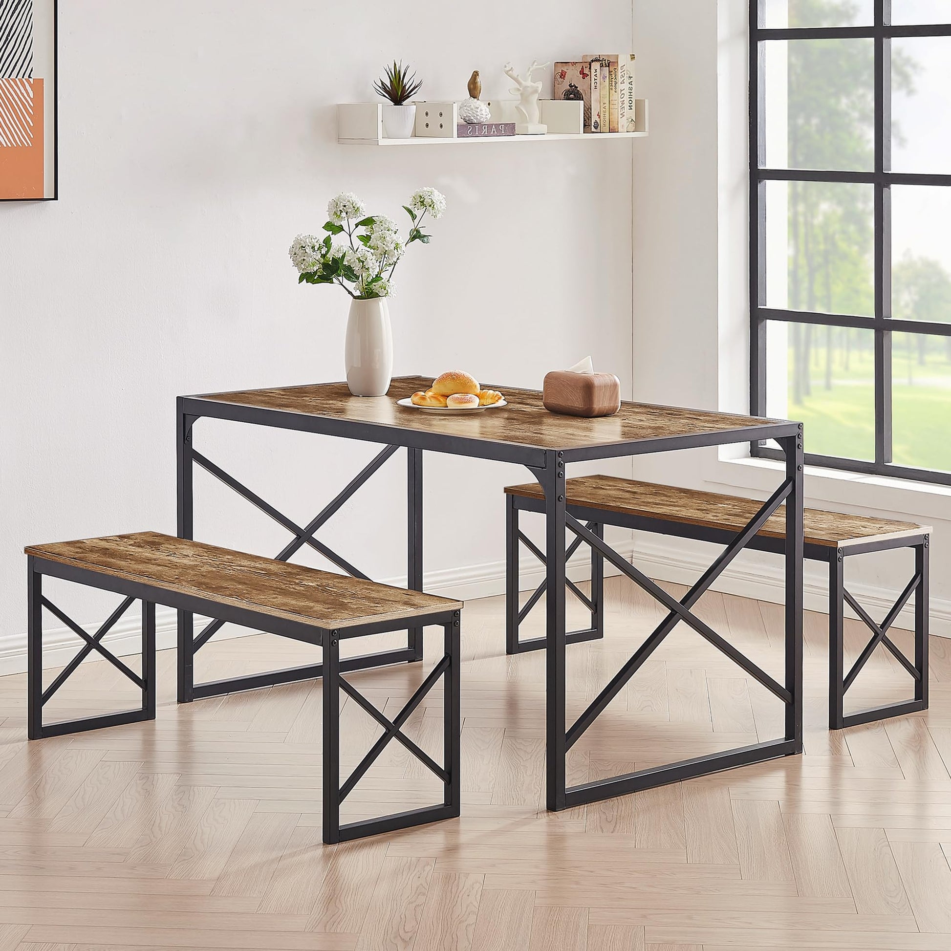Kitchen Table with 2 Benches for 6,Wood Dining Room Dinette Sets with Metal Frame