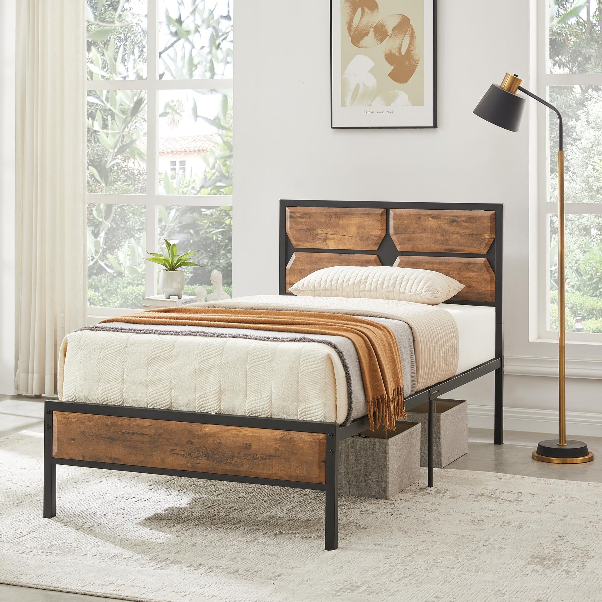 Twin Bed Frame Heavy Duty Metal Platform with Wooden Headboard Footboard Mattress