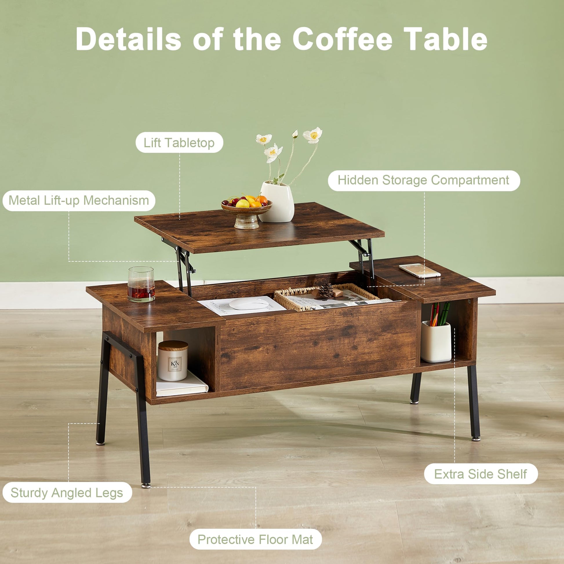 - This storage coffee table features a unique adjustable tabletop, allowing to raise the height as needed. No need to lean forward to reach your laptop or the coffee and snacks on the coffee tables in living room. The upgraded metal mechanism ensures smooth and easy operation, providing you with a worry-free experience.