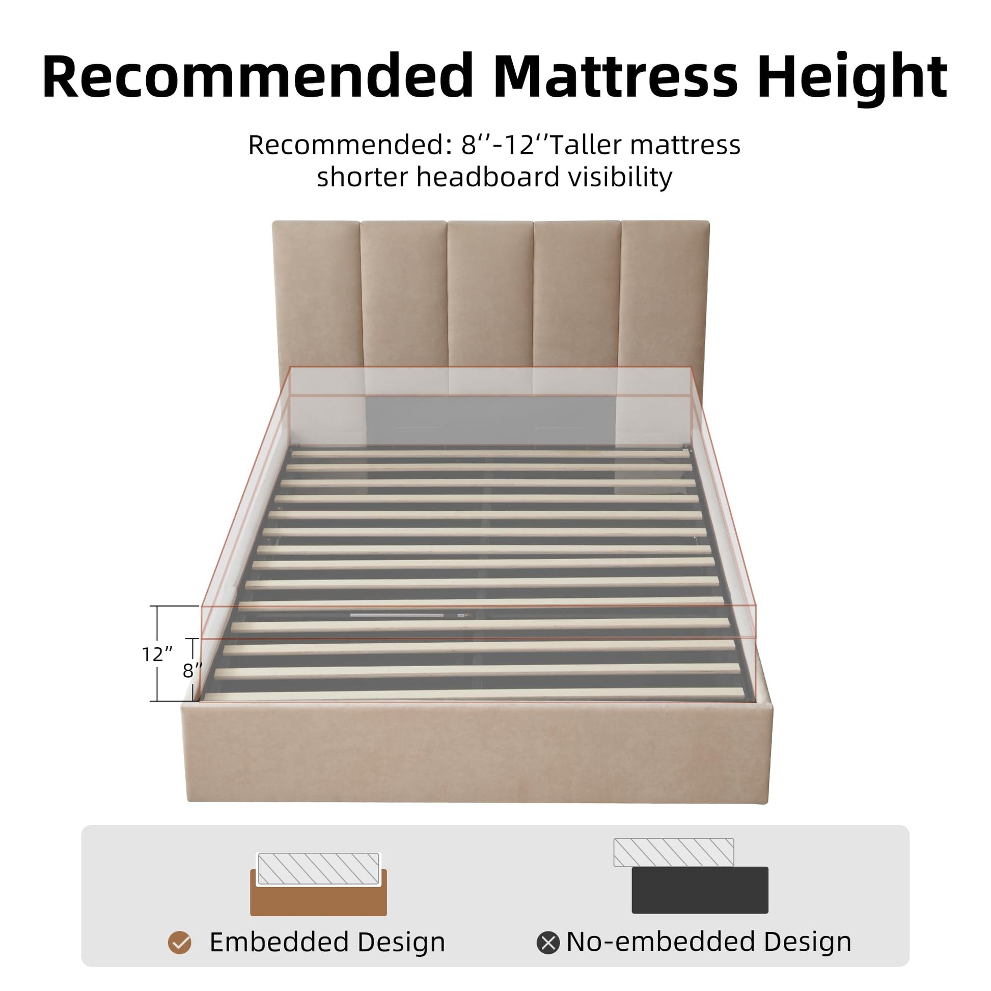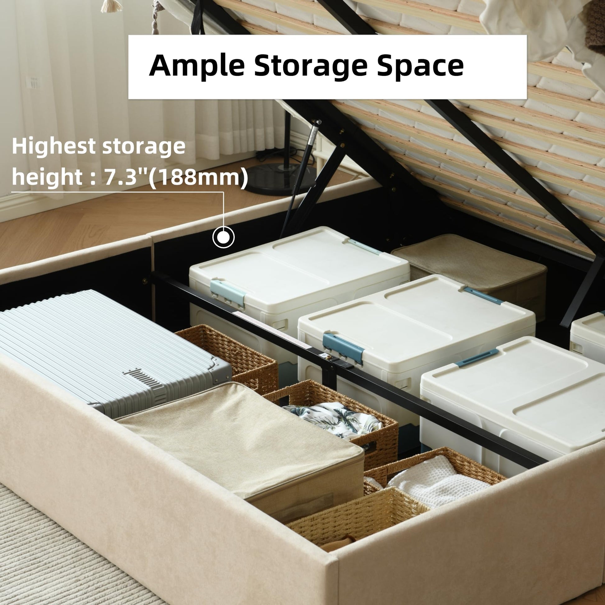 Queen Bed Frame with Storage, Beige, Lift Up Mechanism, Soft Upholstered, Headboard,